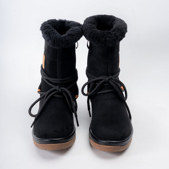 Winter Luxe - Black Casual Fur Boots are crafted to combine ultimate warmth with standout winter style. Featuring a plush fleece cuff, rich suede-texture black upper, and tan accent patch, these boots wrap your feet in comfort during chilly days. The lace-wrap design and rugged sole ensure secure wear and city-ready versatility, making them a must-have for seasonal wardrobes.