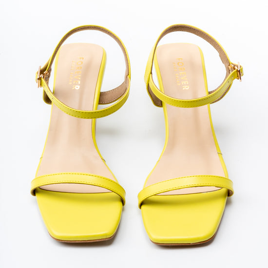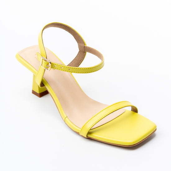 Brighten up your wardrobe with these vibrant yellow block-heeled sandals. Designed with a sleek single front strap, modern square toe, and a minimal ankle buckle for a secure fit, these sandals add a pop of playful color to any outfit. The low block heel ensures comfort without compromising on chic style.