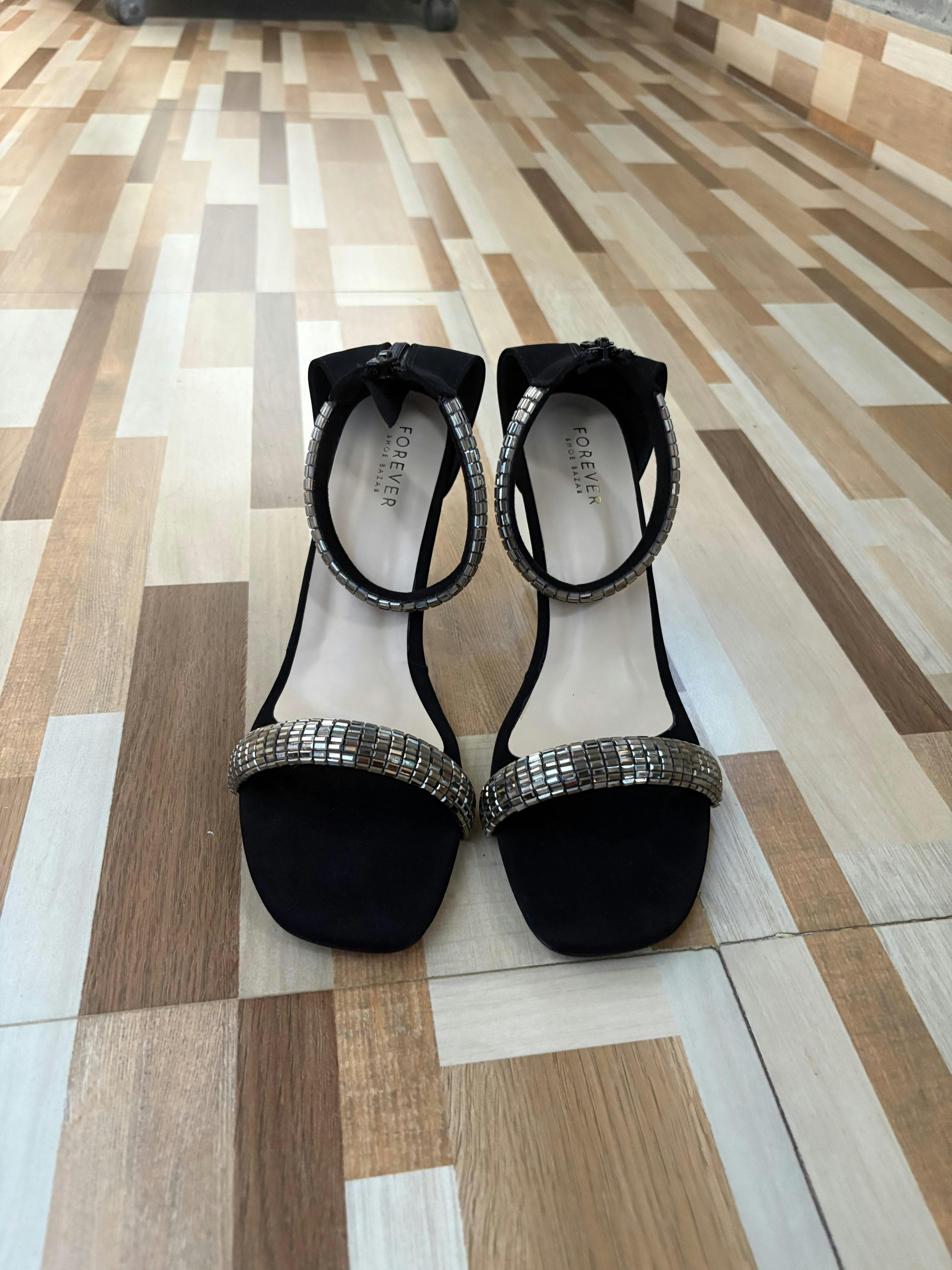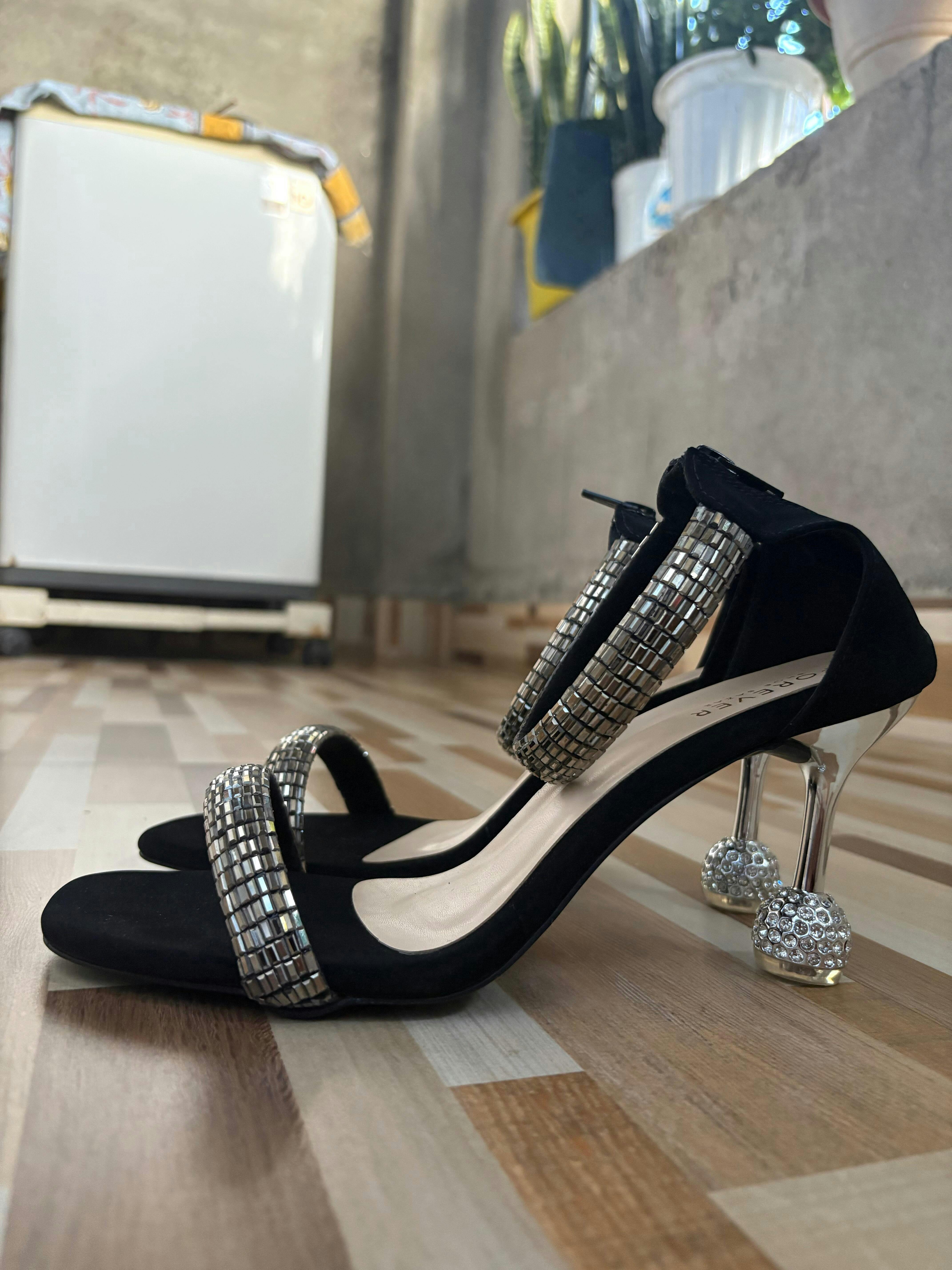 Step into the spotlight with these dazzling black stiletto heels featuring striking silver embellishments. The dual-strap design—one across the toe and another at the ankle—offers a secure fit while exuding modern glam. The standout feature is the sculpted heel adorned with sparkling crystals, adding a luxurious, statement finish. Crafted for evening elegance, these heels are perfect for occasions that call for a bold and chic flair.