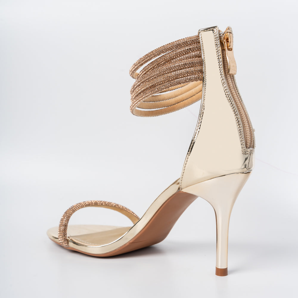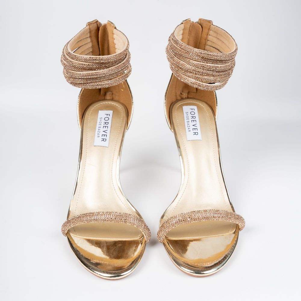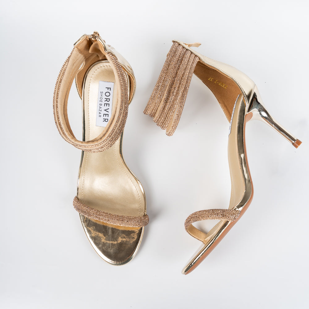 Material: PU(Polyurethane) USP: Rhinestones Closure Type: Sandal Colour: Gold Heel Height: 9.0 cm Occasion: Party Wear Shoe Sole: Synthetic Sheet Sole |