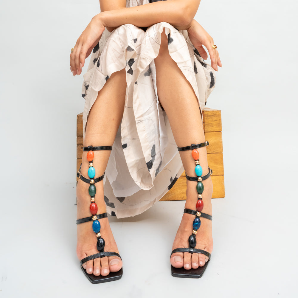 Calf-length colorful beaded heels with strap detailing for a casual yet bohemian vibe. Sandal-like closure for ultimate support and comfort to keep you elevated all day long.
