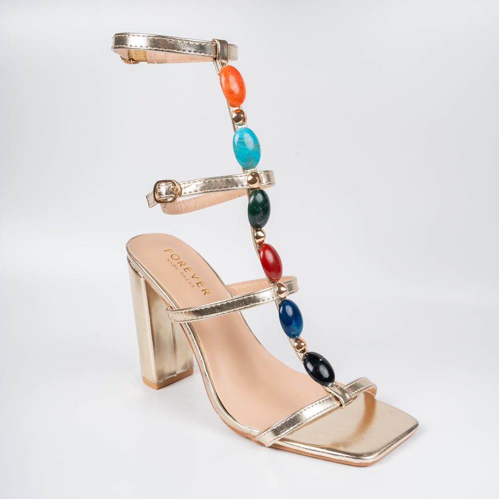 Calf-length colorful beaded heels with strap detailing for a casual yet bohemian vibe. Sandal-like closure for ultimate support and comfort to keep you elevated all day long.