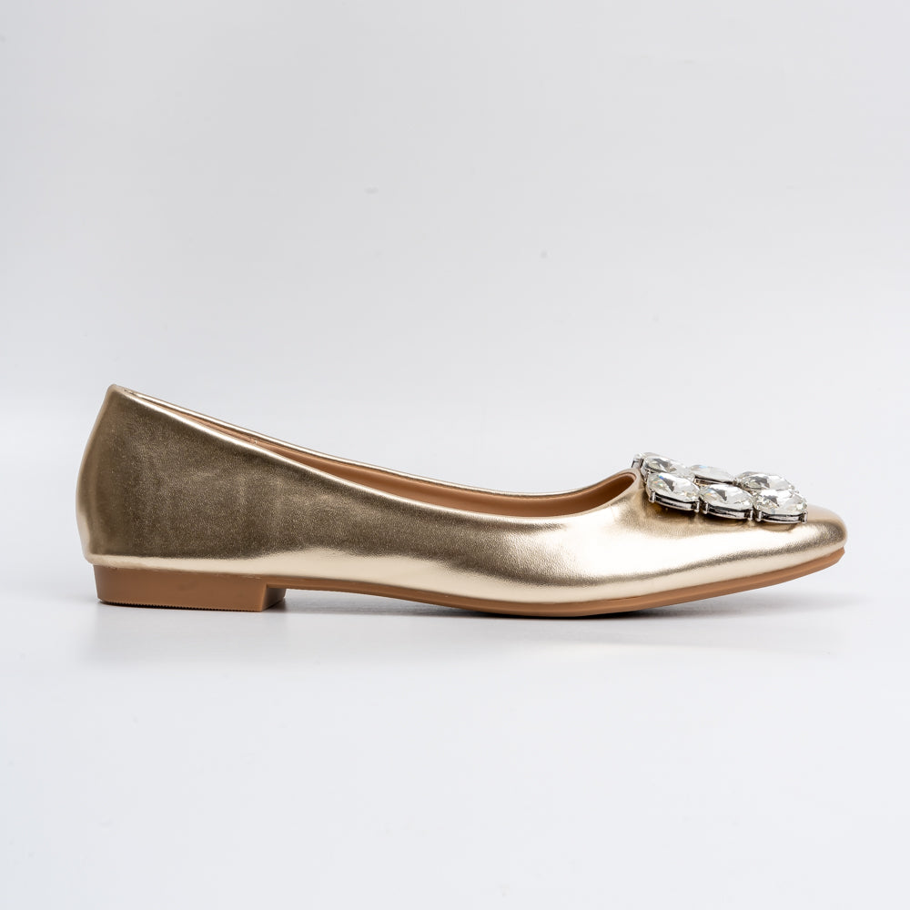 Add a touch of luxury to your look with these gold partywear ballerinas, featuring a dazzling square stone buckle. Perfect for shining through any special occasion with elegance and charm.