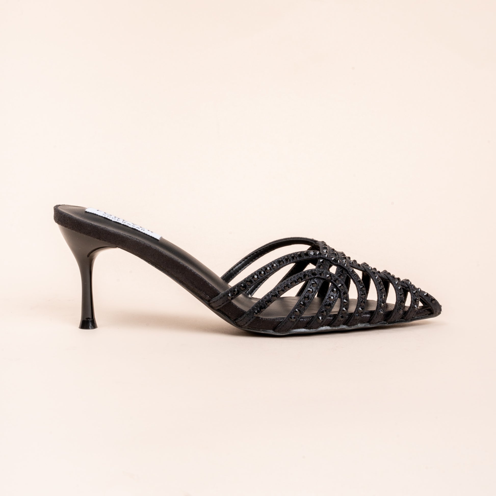Material: PU(Polyurethane) USP: Rhinestones Closure Type: Mules Colour: Black Heel Height: 7.0 cm Occasion: Party Wear Shoe Sole: Synthetic Sheet Sole |