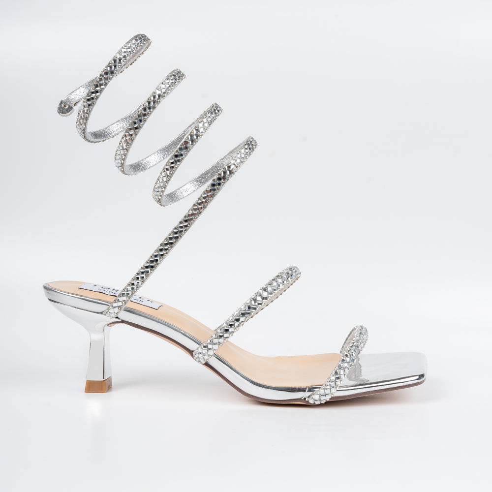 Step into bold elegance with these partywear heels, featuring snake straps adorned with rhinestones. Designed to make a statement, they're perfect for glamorous nights out.