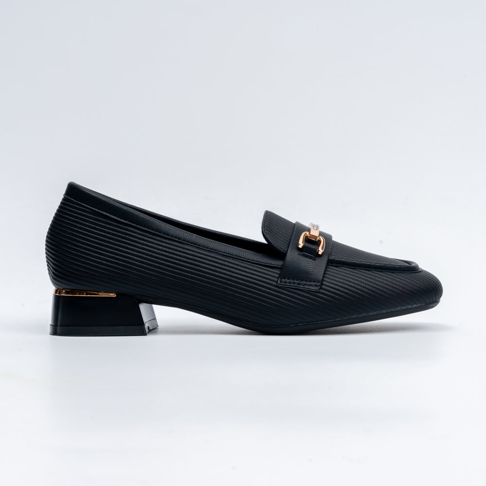 Elevate your everyday look with these Textures Tales - Black Casual Loafers, available in classic black and chic nude beige. Crafted with a unique ribbed faux leather finish, these loafers stand out with their modern texture and sophisticated appeal. The gold-tone metal bar detail across the vamp adds a refined touch, while the low block heel with a metallic accent ensures comfort with style. These versatile loafers are perfect for work, casual outings, or when you want to add polish to your everyday wardrobe.