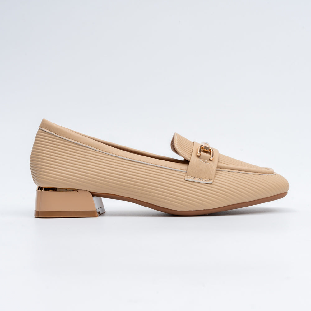 Elevate your everyday look with these Textures Tales - Beige Casual Loafers, available in classic black and chic nude beige. Crafted with a unique ribbed faux leather finish, these loafers stand out with their modern texture and sophisticated appeal. The gold-tone metal bar detail across the vamp adds a refined touch, while the low block heel with a metallic accent ensures comfort with style. These versatile loafers are perfect for work, casual outings, or when you want to add polish to your everyday wardrobe.