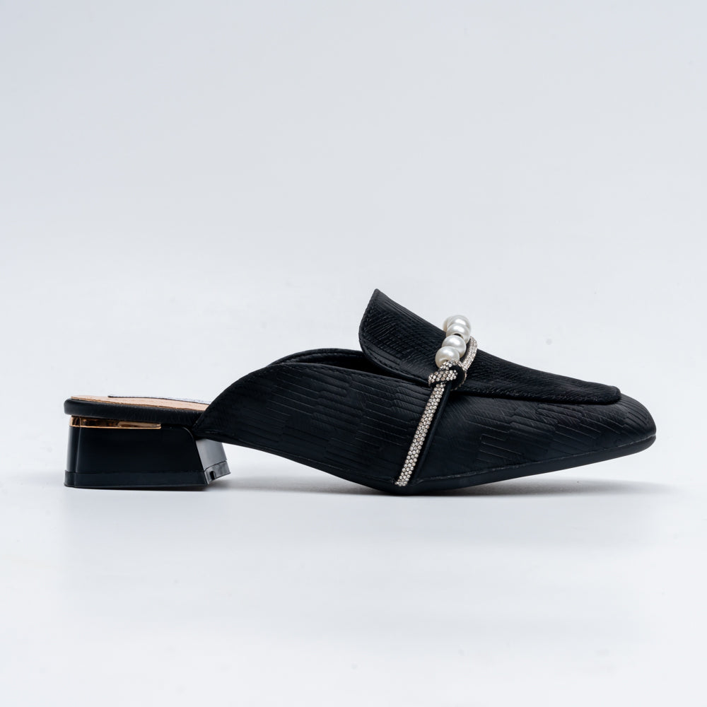 Step into timeless elegance with Aria Pearl - Black Casual Mules. Designed with a textured faux leather finish and adorned with a row of lustrous pearls paired with delicate rhinestone detailing, these slip-on mules bring the perfect balance of sophistication and comfort. Featuring a low block heel and cushioned insole, they are a versatile choice for both workdays and evenings out.