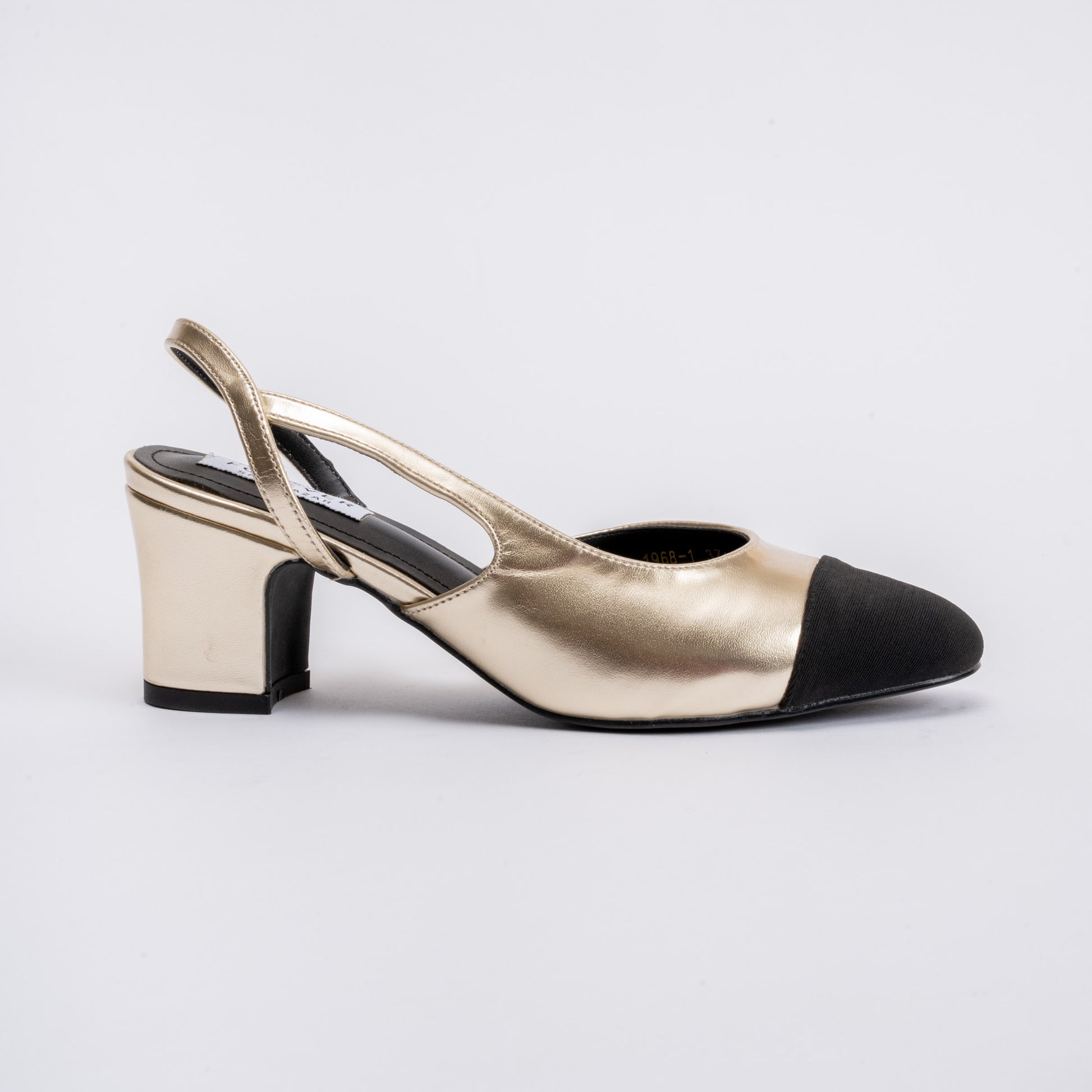 Product Details Material: PU(Polyurethane) USP: Kitten Heels Closure Type: Slingback Colour: Black & Gold Heel Height: 6.0 cm Occasion: Party Wear Shoe Sole: Synthetic Sheet Sole |