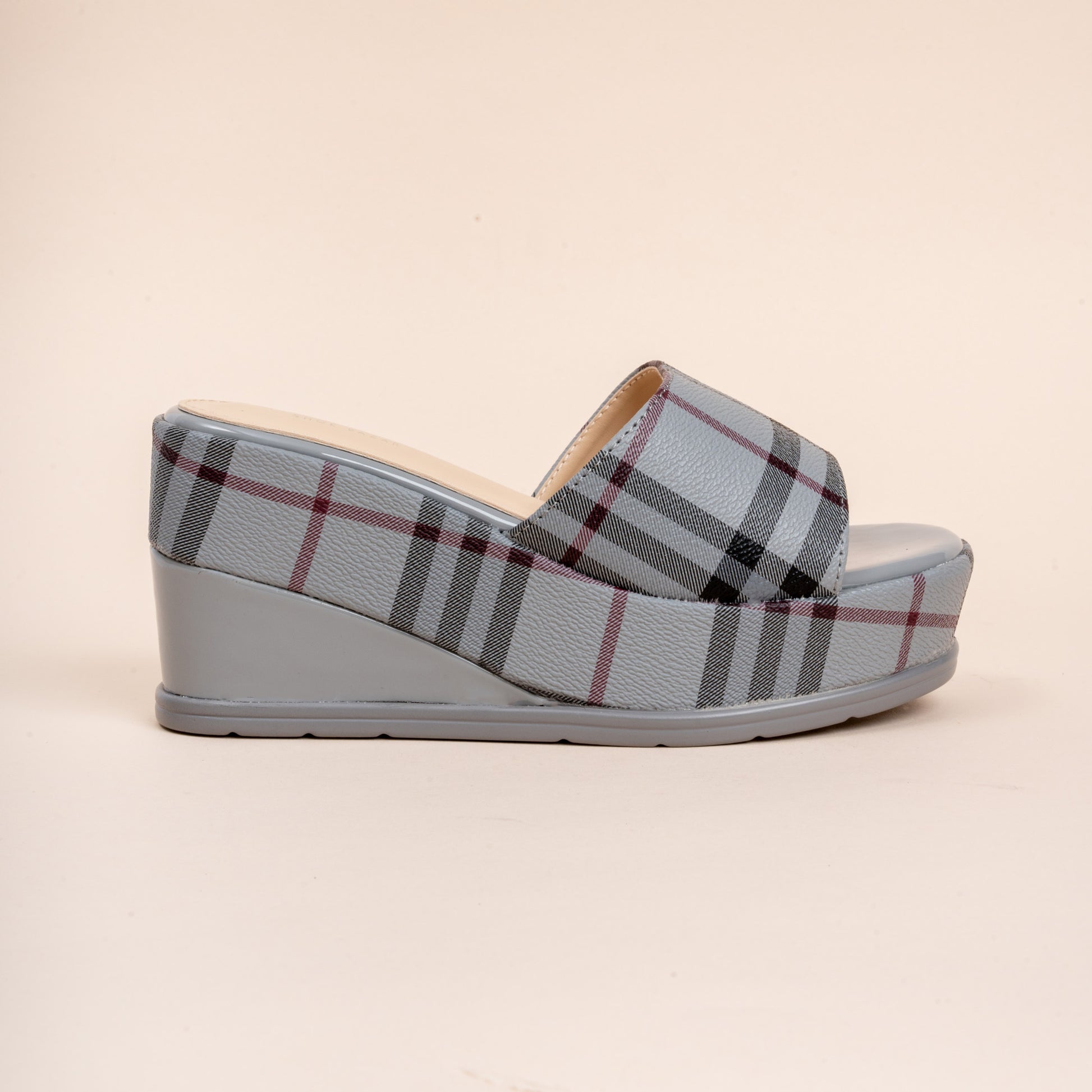 Product Details Material: PU(Polyurethane) USP: Check Material Closure Type: Platform Slipper Colour: Grey Heel Height: 8.0 cm Occasion: Party Wear Shoe Sole: PU Sole |
