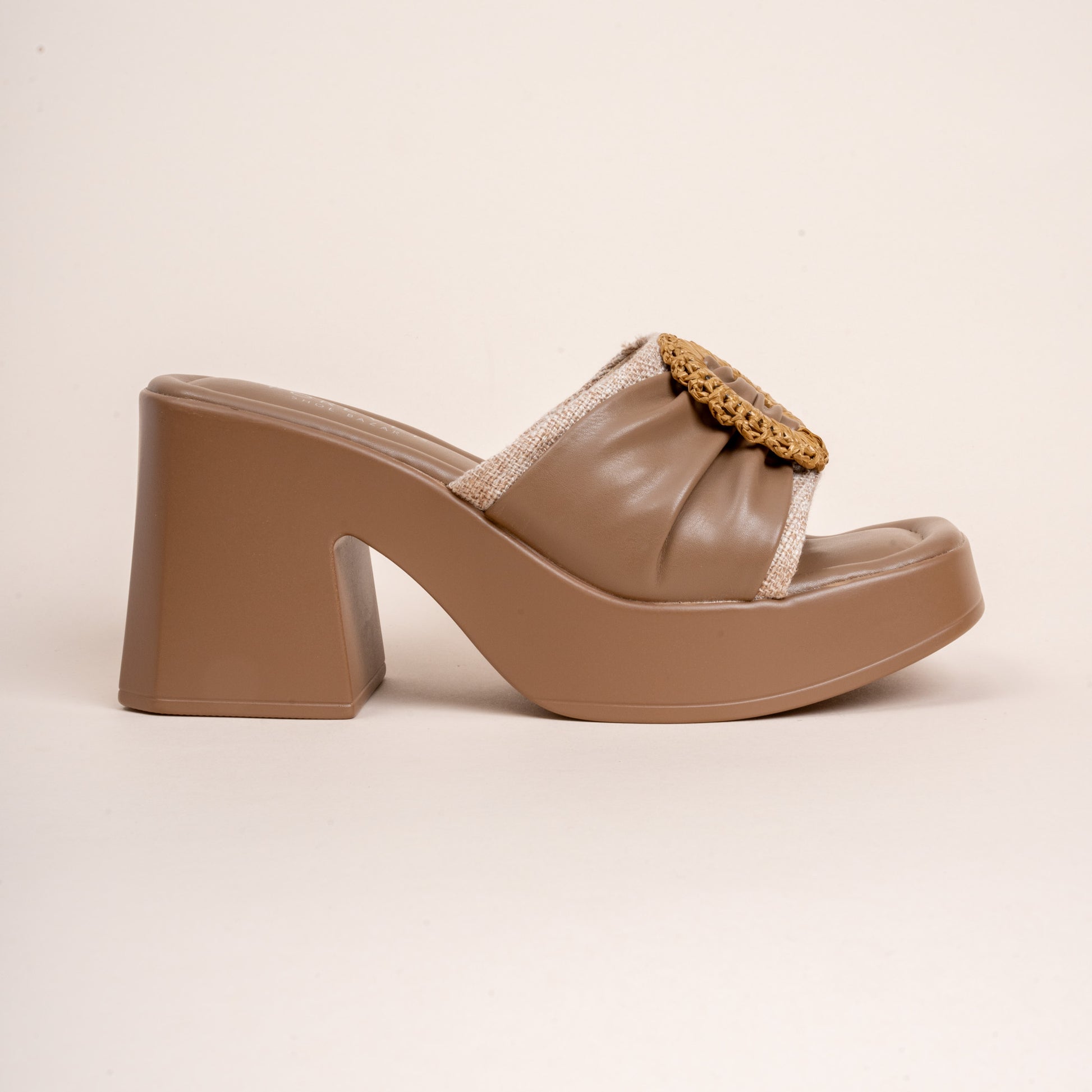 Elevate your style with these beige block heels, adorned with a rustic charm for a unique touch of elegance. Perfect for adding flair to your everyday wardrobe.