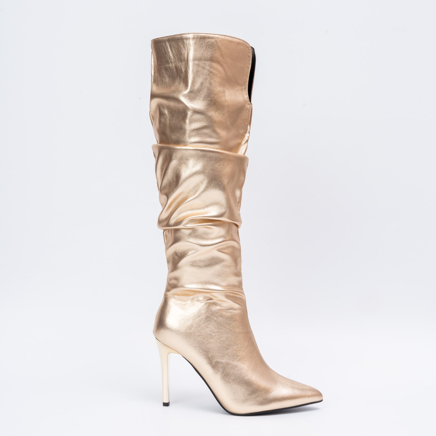 Material: PU(Polyurethane) USP: Metallic Wrinkled Finish with Pointed Toe Stiletto Heel Closure Type: Side Zipper Color: Gold Length: 51.0 cm Heel Height: 9.0 cm Occasion: Party Wear Shoe Sole: Synthetic Sheet Calf Circumference: 17.0 cm |