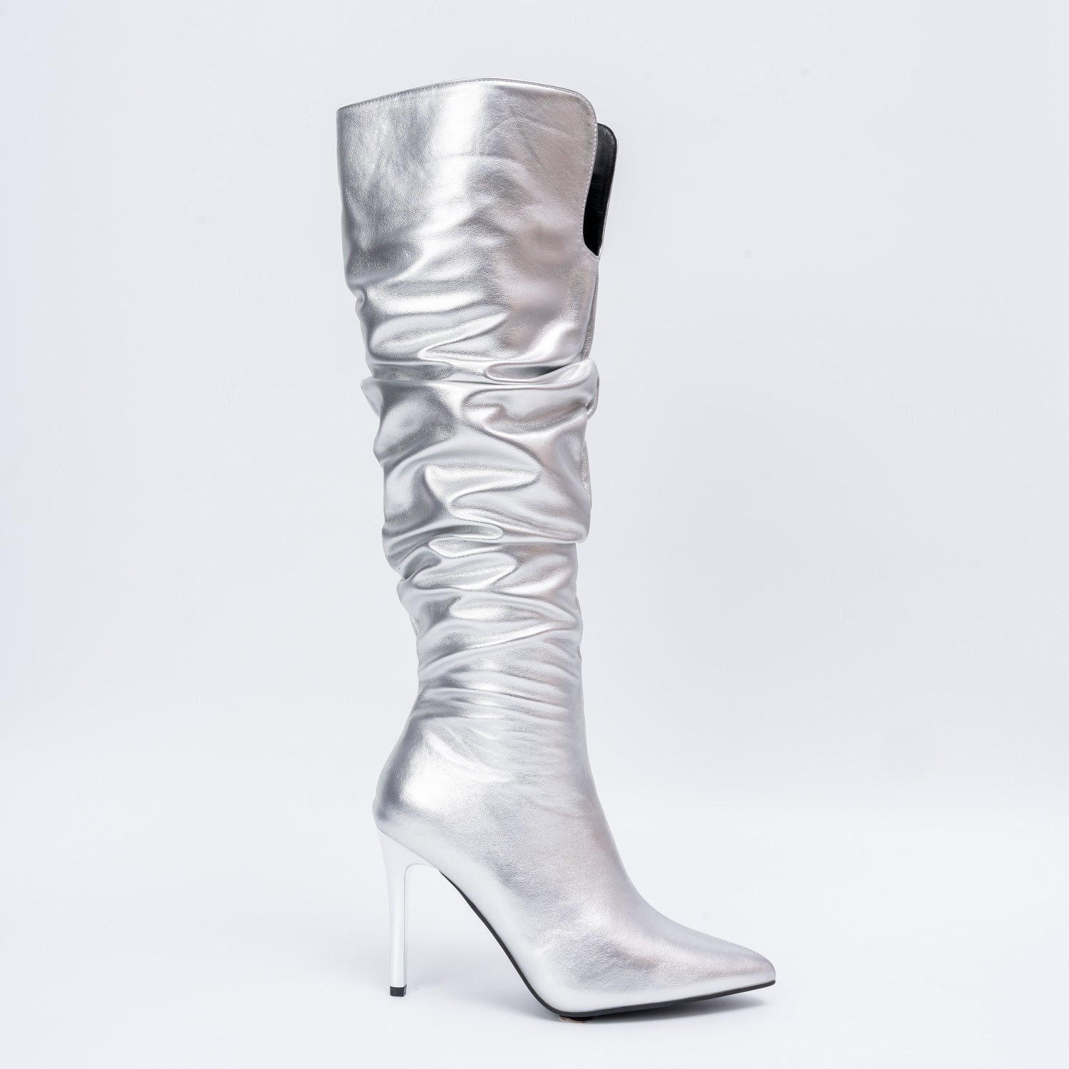 Material: PU(Polyurethane) USP: Metallic Wrinkled Finish with Pointed Toe Stiletto Heel Closure Type: Side Zipper Color: Silver Length: 51.0 cm Heel Height: 9.0 cm Occasion: Party Wear Shoe Sole: Synthetic Sheet Calf Circumference: 17.0 cm |