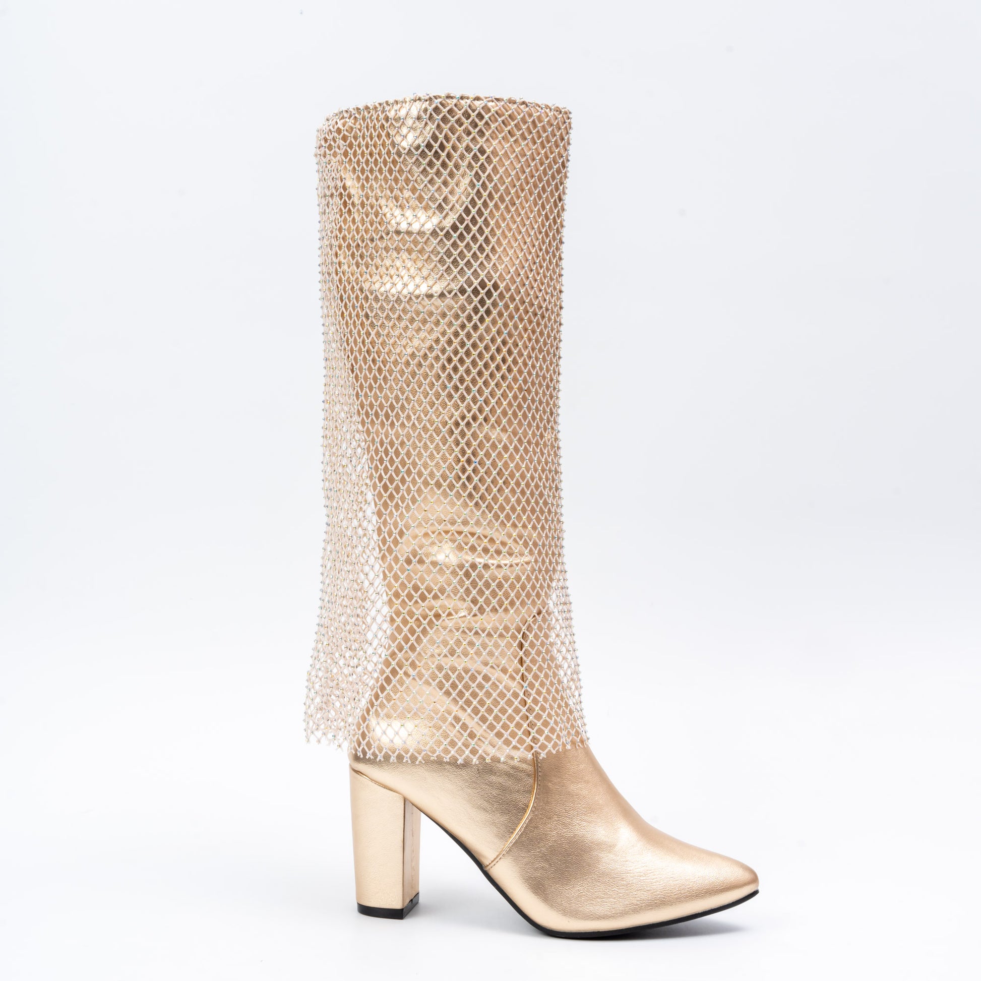 Dazzle like never before in these partywear boots, boasting a shimmering metallic finish paired with a stunning rhinestone chainmail overlay. Perfect for standout nights.