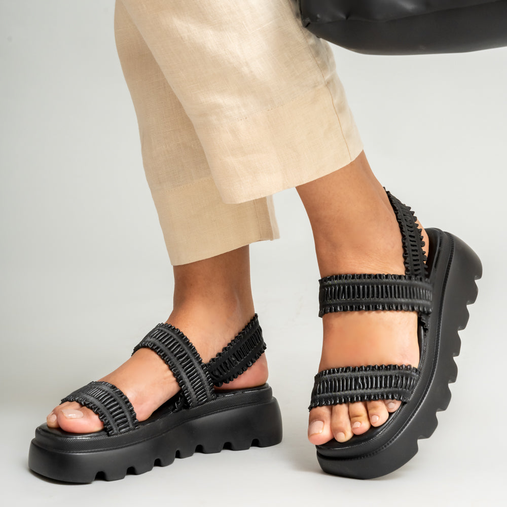 Product Details Material: PU(Polyurethane) USP: Textured Elastic Closure Type: Platform Sandal Colour: Black Heel Height: 5.0 cms Occasion: Casual Wear Shoe Sole: PU Sole |