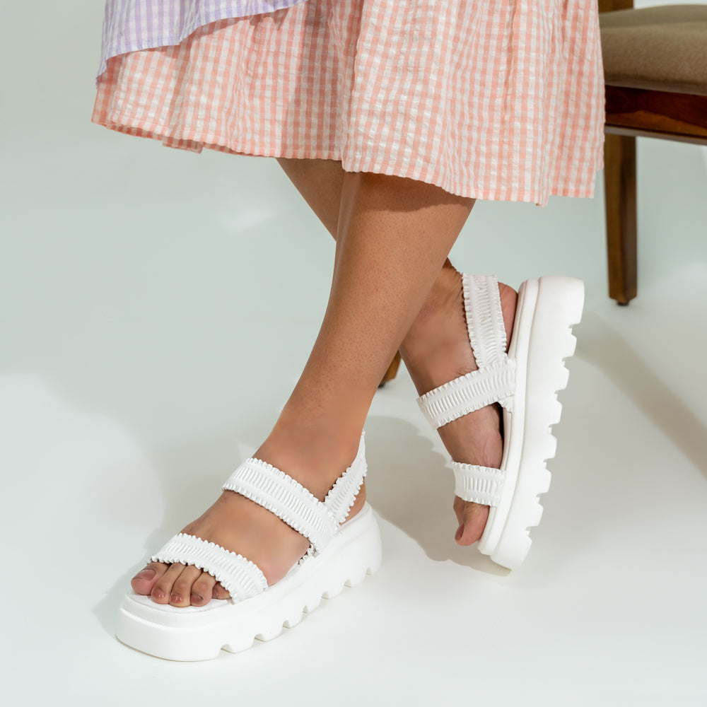 Product Details Material: PU(Polyurethane) USP: Textured Elastic Closure Type: Platform Sandal Colour: White Heel Height: 5.0 cms Occasion: Casual Wear Shoe Sole: PU Sole |