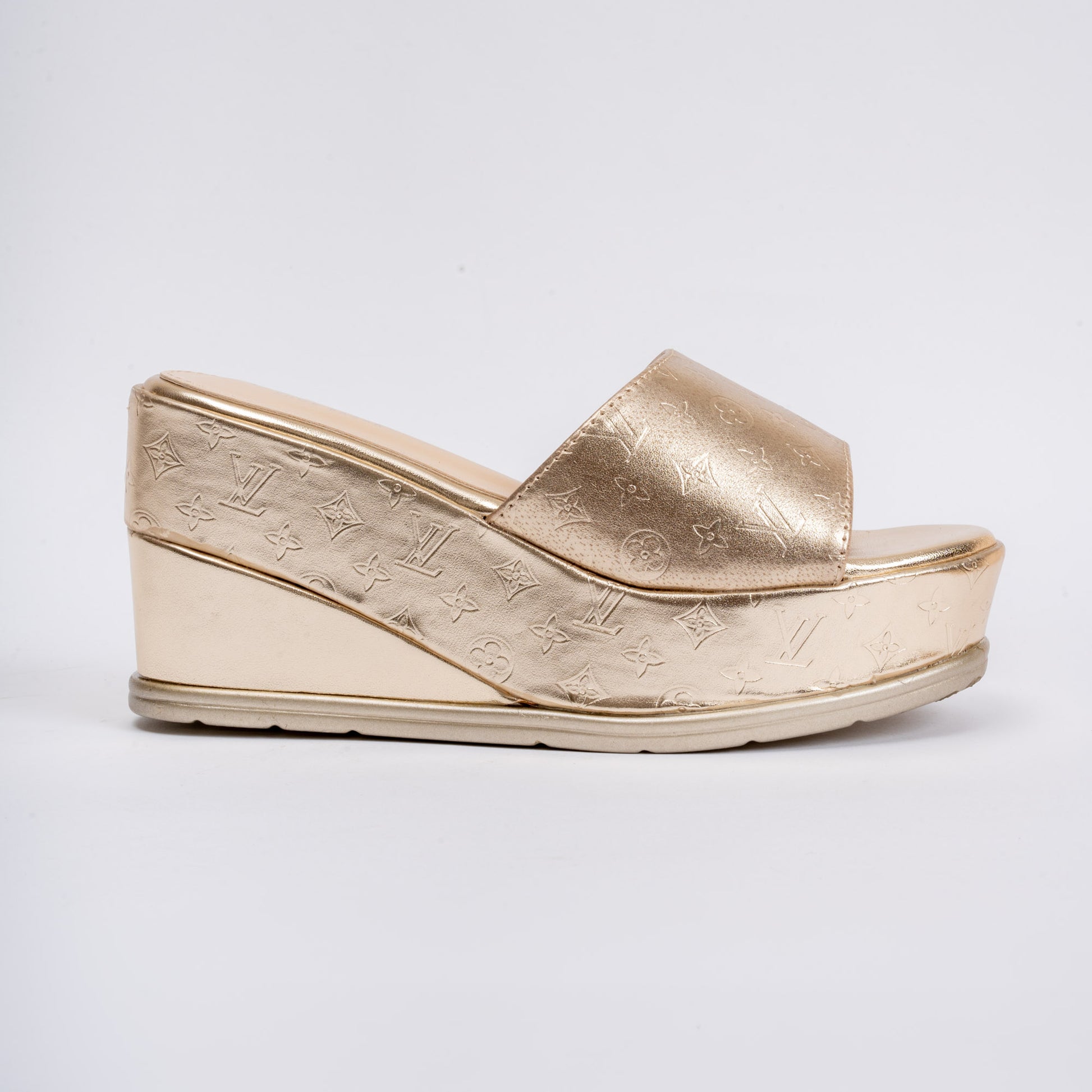 Product Details Material: PU(Polyurethane) USP: Textured Upper Closure Type: Platform Slipper Colour: Gold Heel Height: 8.0 cm Occasion: Party Wear Shoe Sole: PU Sole |