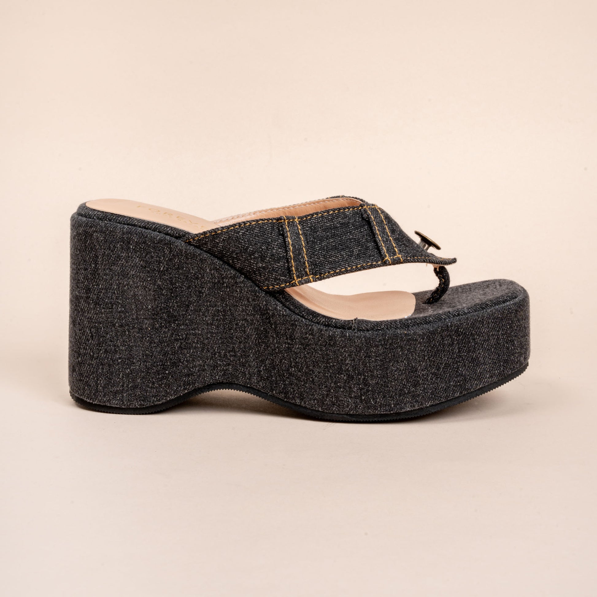Easy to put on, flip-flop-styled denim wedges for your everyday comfort. Adorned with a denim button for a quirky touch, these heels will heighten even a basic look.