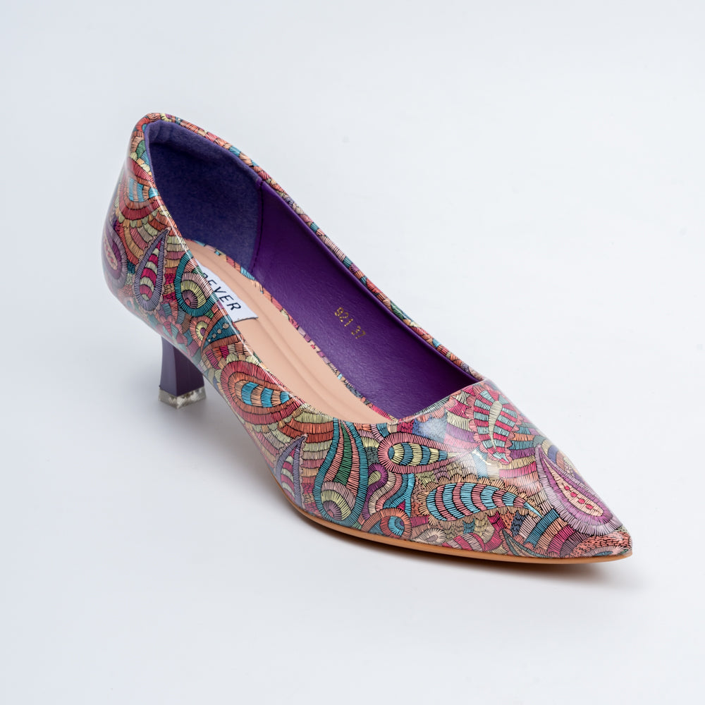 Embrace artistry and flair with these Kaleidoscope - Purple Pumps —a vibrant testament to thoughtful design. Each shoe boasts a swirling arrangement of teardrop-shaped paisley motifs in warm sunset hues: burnt orange, earthy ochre, and rich sienna, all intricately layered with delicate tonal lines. The pointed toe silhouette elongates the foot, while the modest mid-height block heel ensures both poise and comfort. These pumps are a statement-making yet wearable piece—perfect for injecting character into both casual and polished outfits.