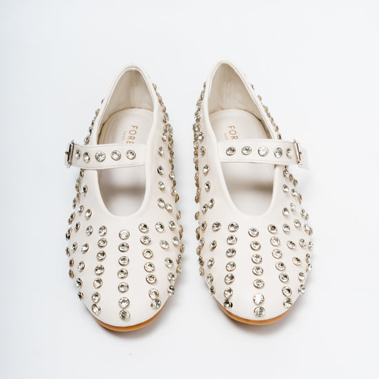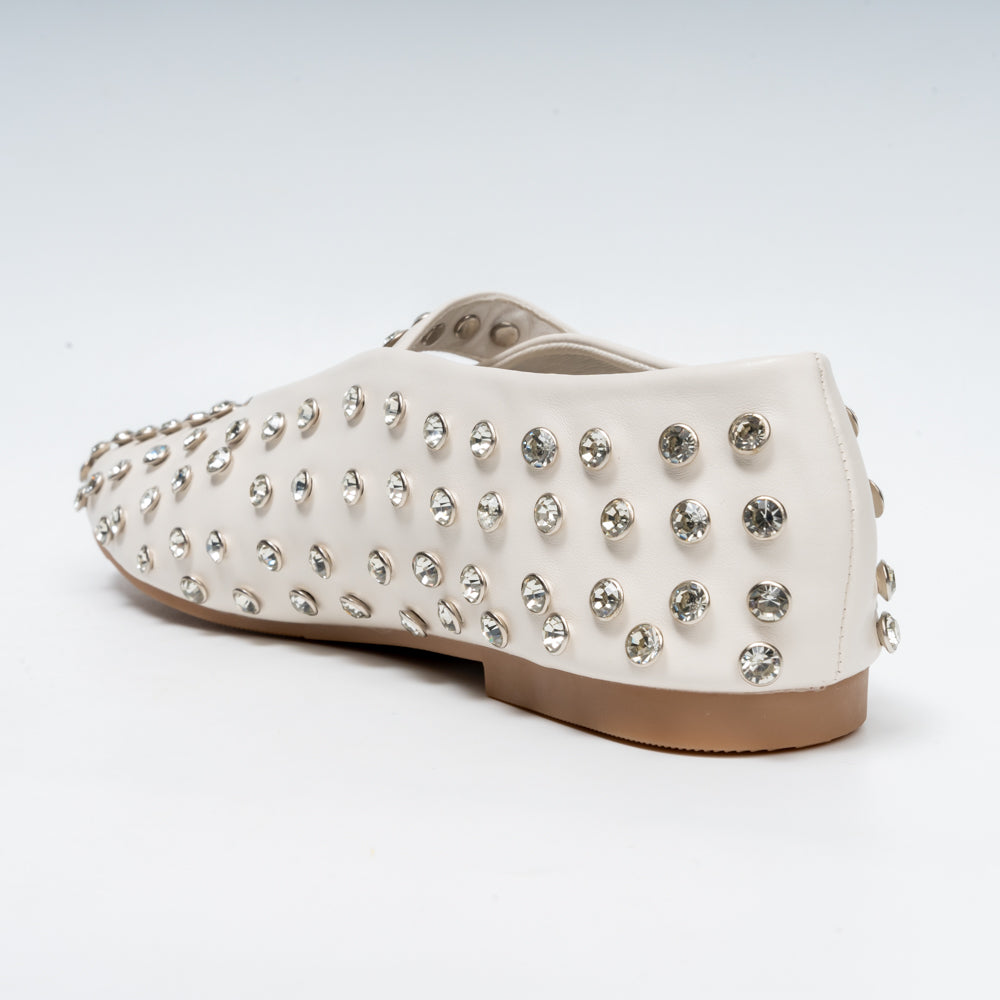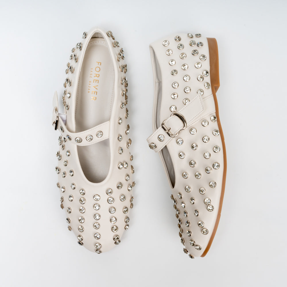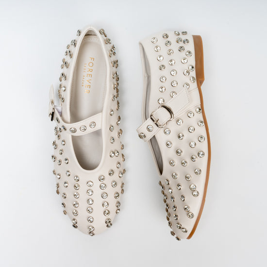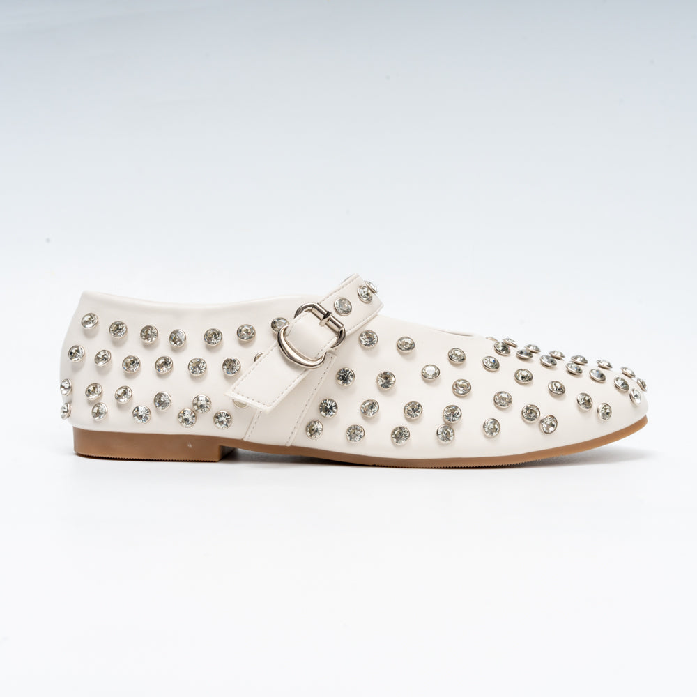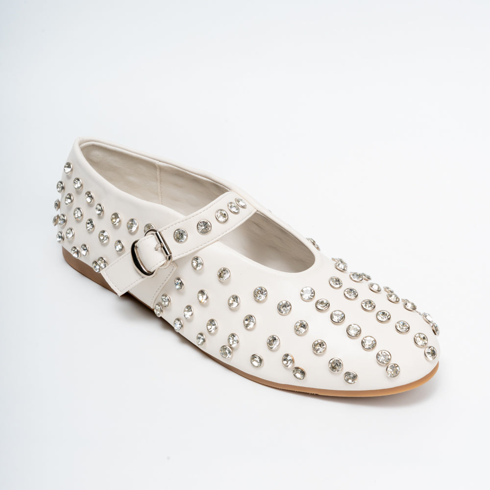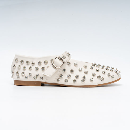 These The Glam Studded - White Flat Ballerinas, embellished with sparkling rhinestones, deliver a touch of glamour and modern elegance to any outfit. The secure strap with buckle detail ensures a comfortable fit, making them ideal for all-day wear.