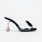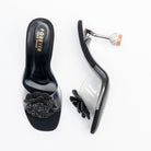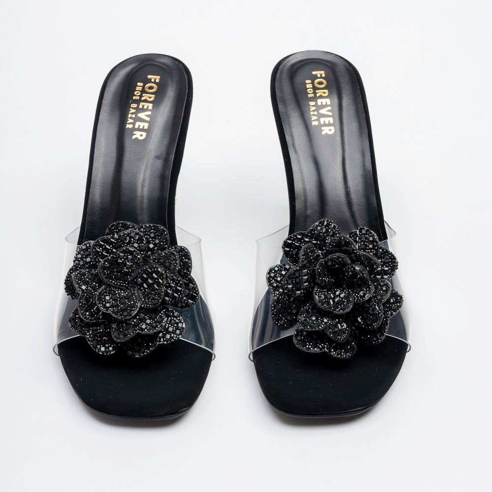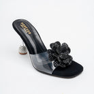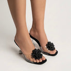 Make a bold entrance in these Celina Crystal Flower stilettos, blending luxurious black velvet at the square toe with crystal heel for a futuristic edge. The oversized textured flower embellishment sparkles with embedded crystals. Slip-on ease meets high-impact drama, ideal for nights out or statement-making events.