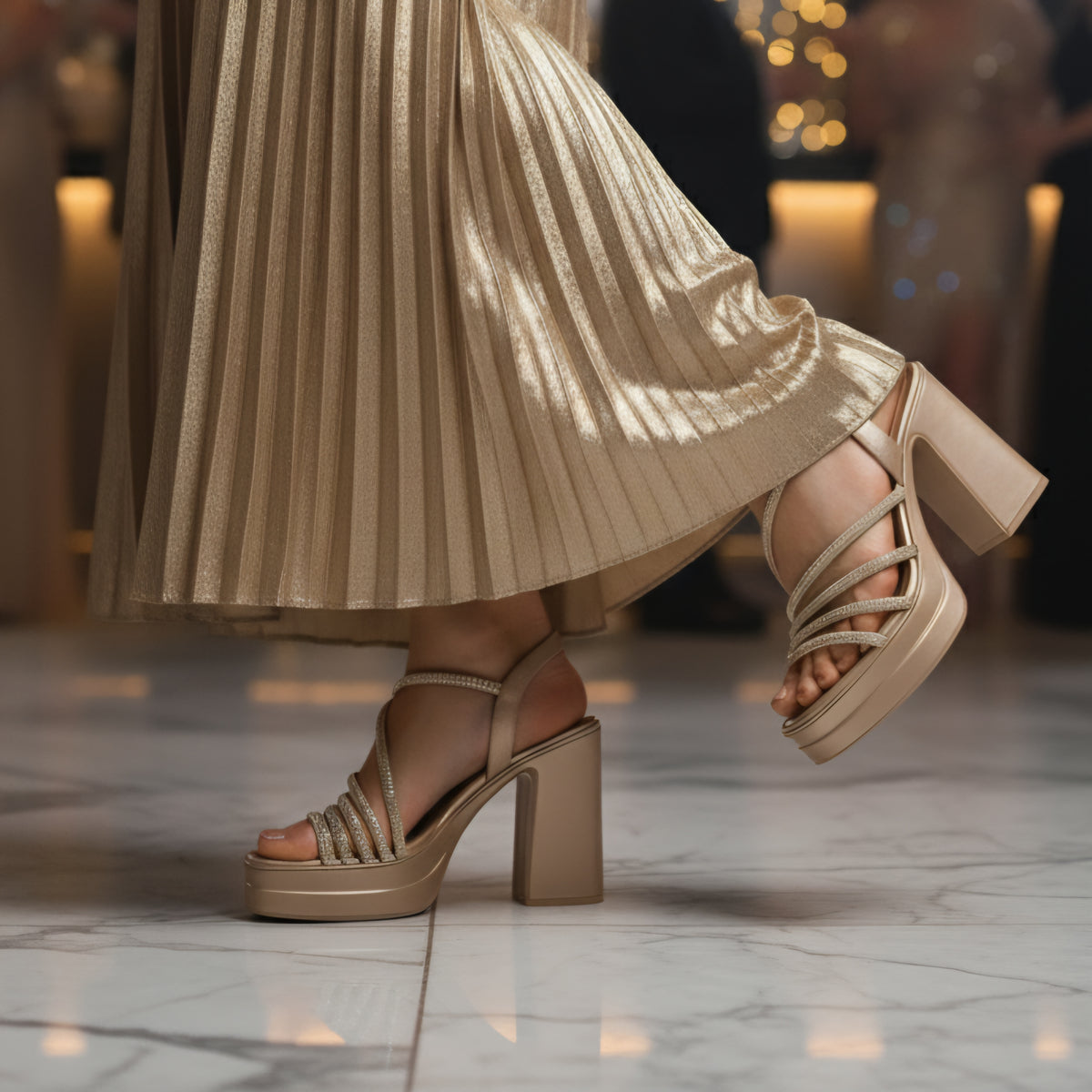 Step into the spotlight—these partywear sandals feature shimmering rhinestone straps and a platform sole for the perfect mix of glam and comfort.