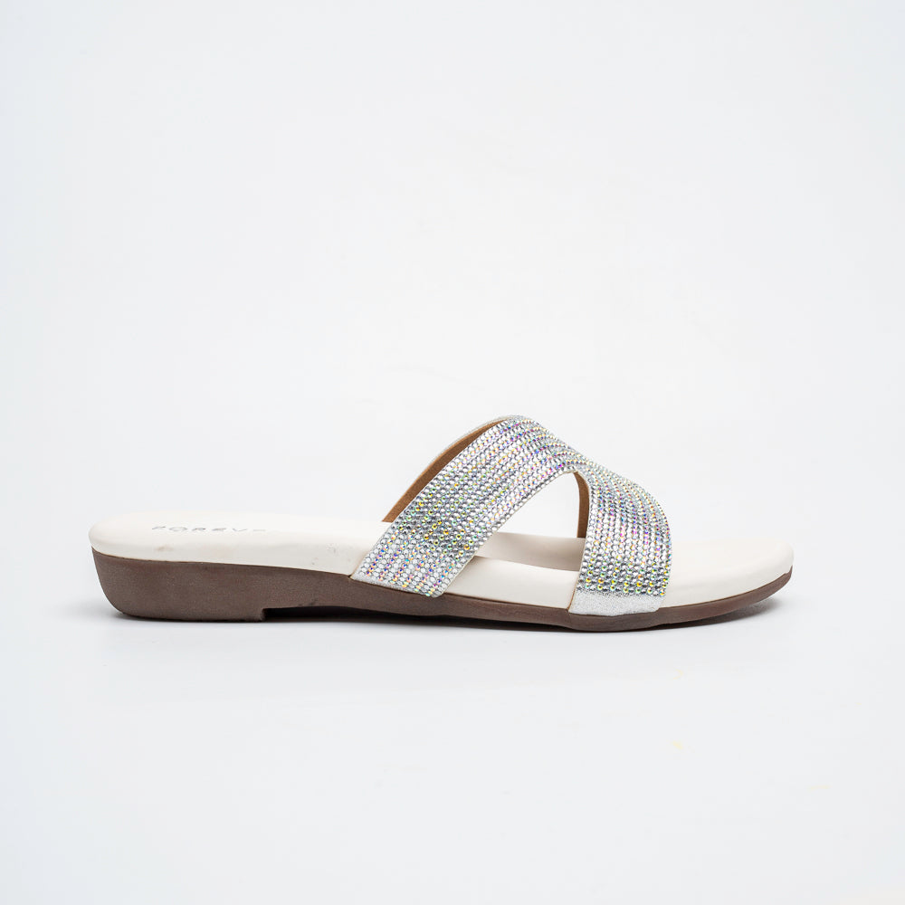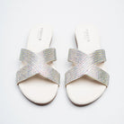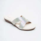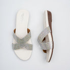 Brighten your step in these Lumiera Crystal Cross Slides, crafted with a cushioned white footbed and flexible beige wedge sole for lightweight comfort and subtle lift. The shimmering multi-hued crystal straps crisscross elegantly over the foot, catching light from every angle for effortless dazzle. Perfect for casual outings or beach days, they fuse boho ease with trendy sparkle.