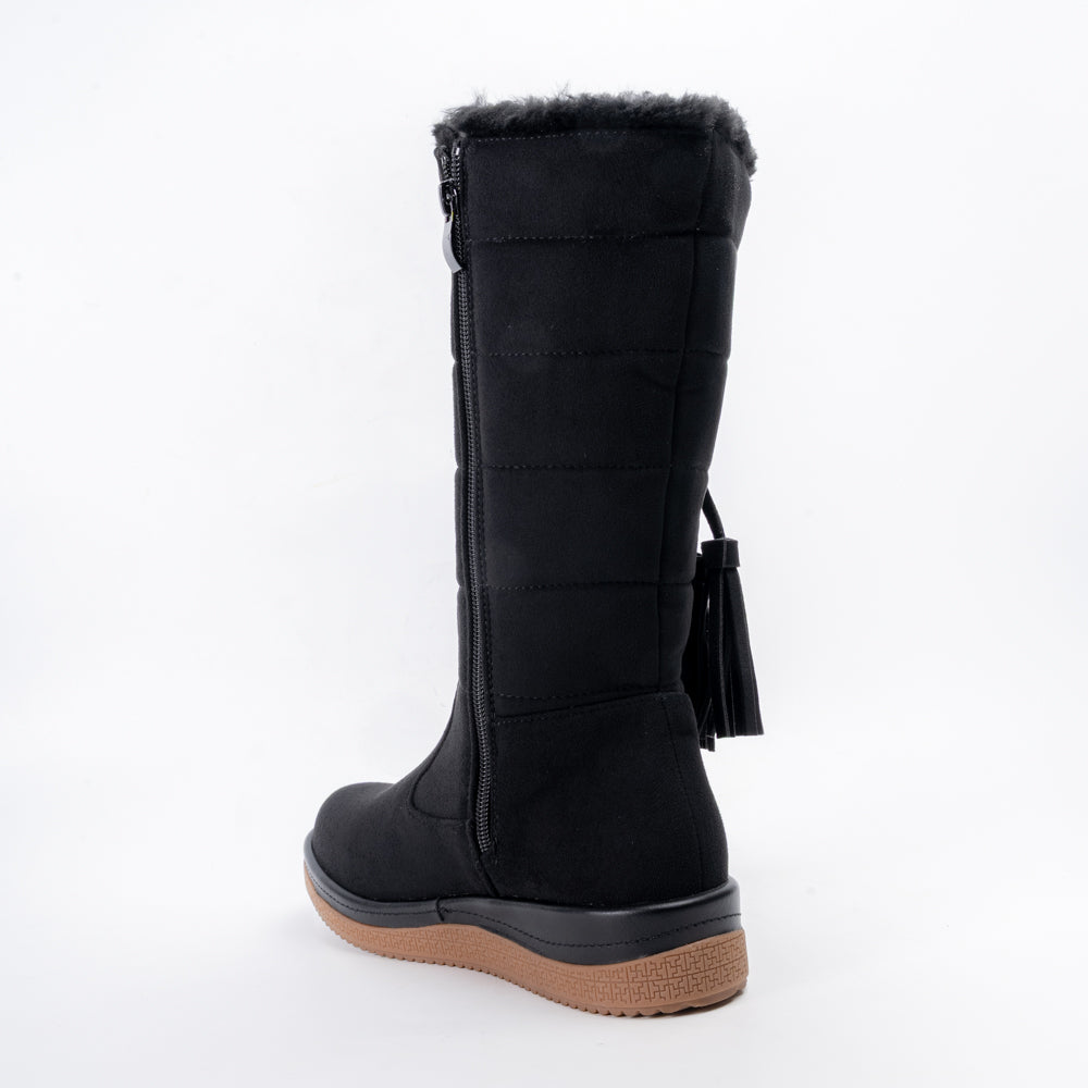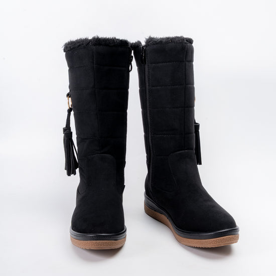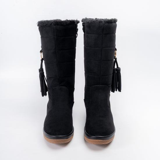 Glacial Muse - Black Casual Fur Boots wrap your feet in plush warmth while keeping your winter style sleek and minimal. The mid-calf silhouette, soft faux-fur lining, and playful tassel-ring detail make them a cozy everyday essential for chilly days and travel.