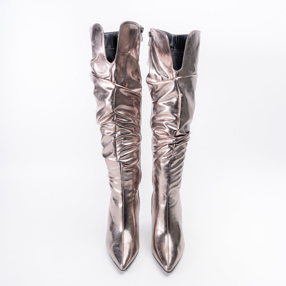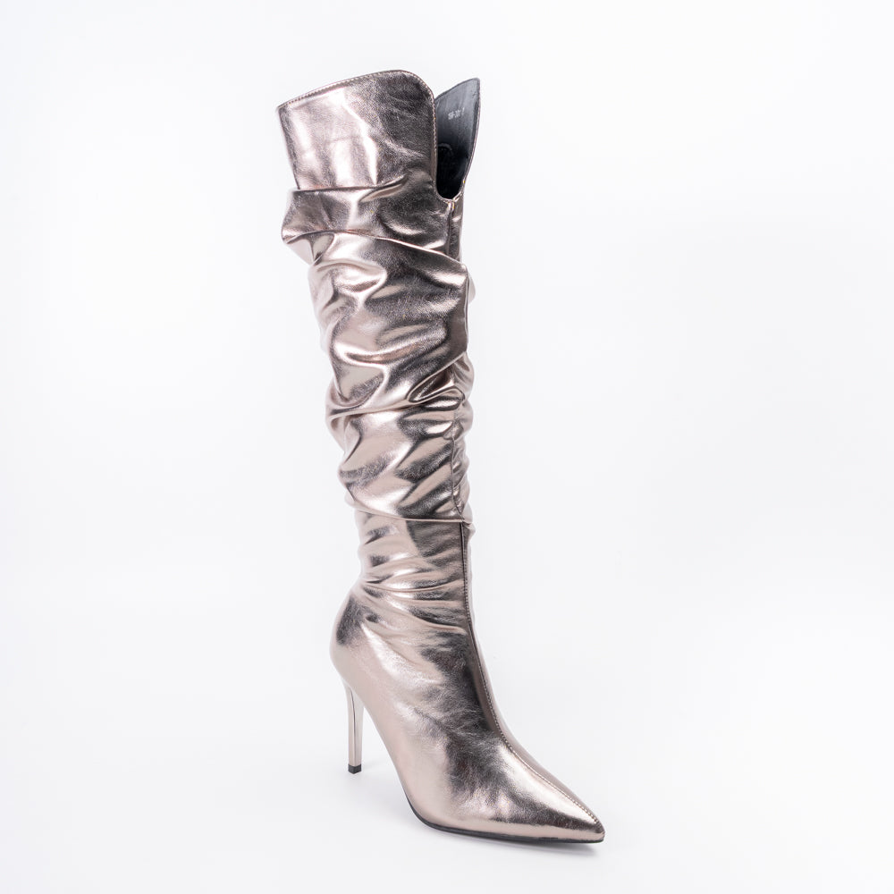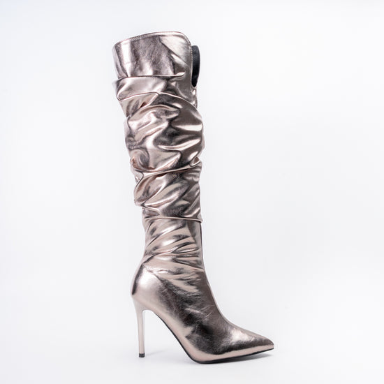 Shine the brightest on every dancefloor with Boot Up Babe – Gun Metal Partywear Boots, designed for those who live to make an entrance. These dazzling knee-high boots feature lustrous metallic grey from heel to toe, with a glamorous slouch shaft and sharp pointed toe bringing runway energy to any celebration. The slim stiletto heel elongates your silhouette for a jaw-dropping, confident vibe—making Boot Up Babe the perfect centerpiece for unforgettable party looks and festive nights.