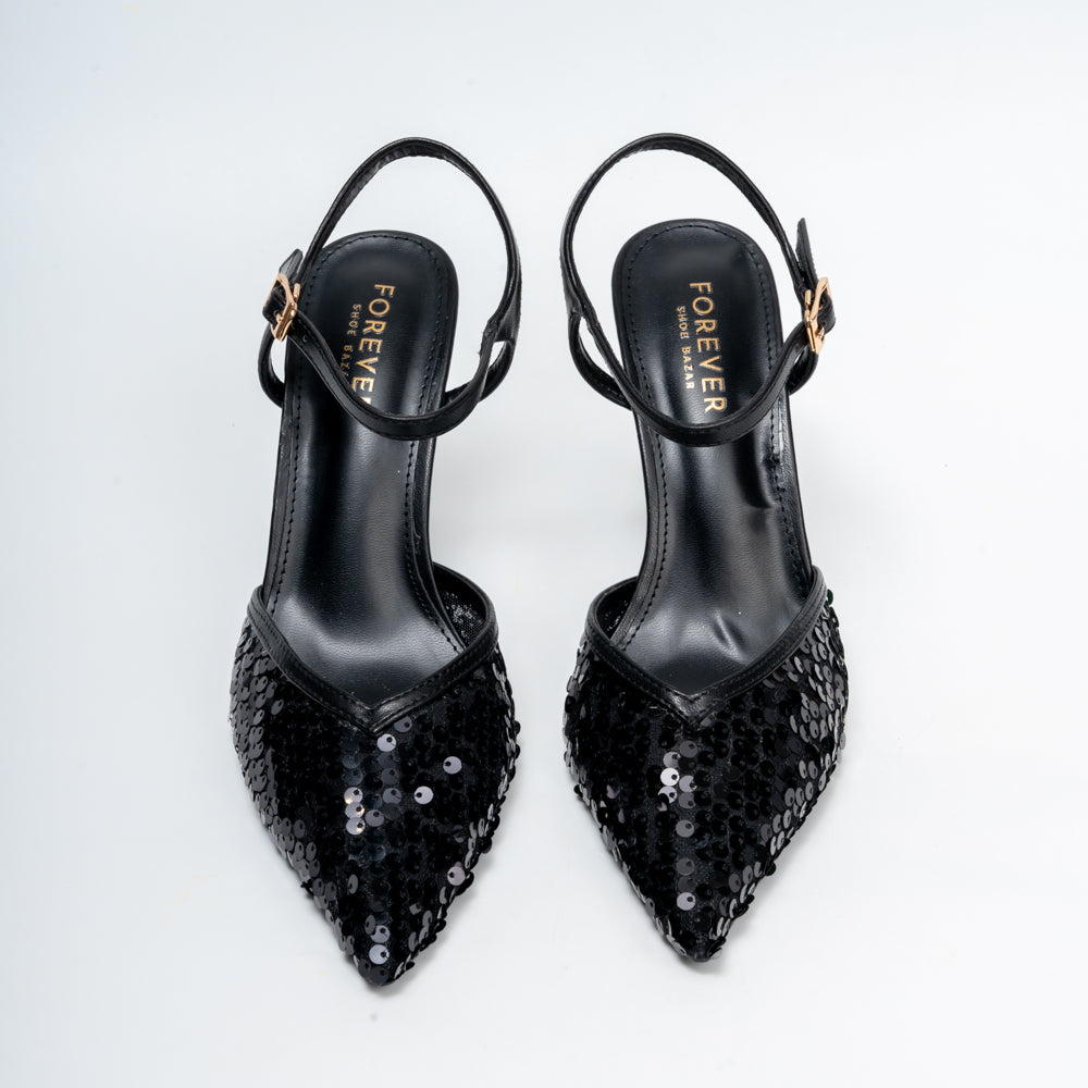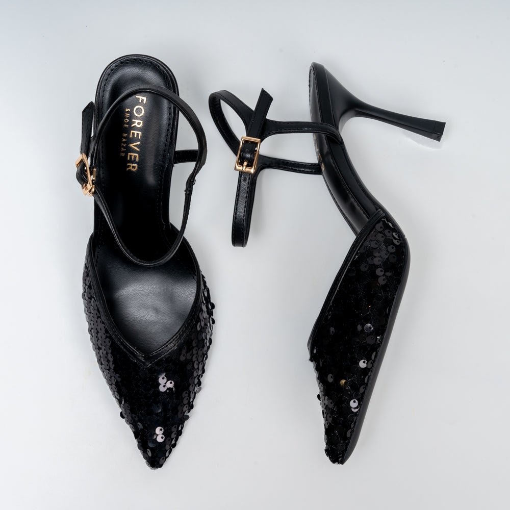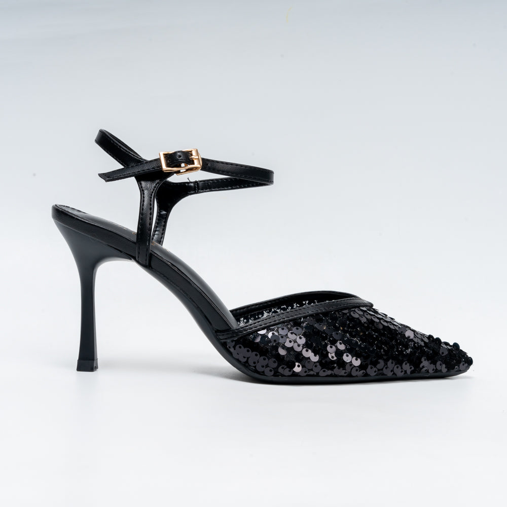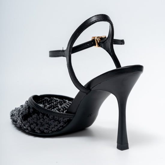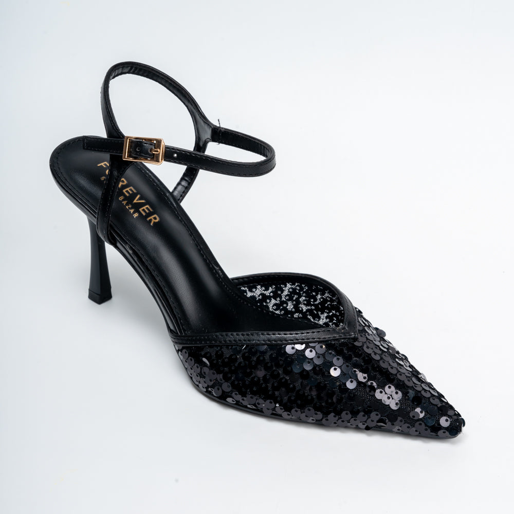 Shimmer through every occasion in these sequined pointed heels, crafted in a rick black hue with a sleek ankle strap that flatters and elongates the legs. Perfect for weddings, parties and festive nights, the slim stiletto heel and mesh-sequin front add just the right amount of sparkle while keeping the look elegant and versatile with both Indian and Western outfits.