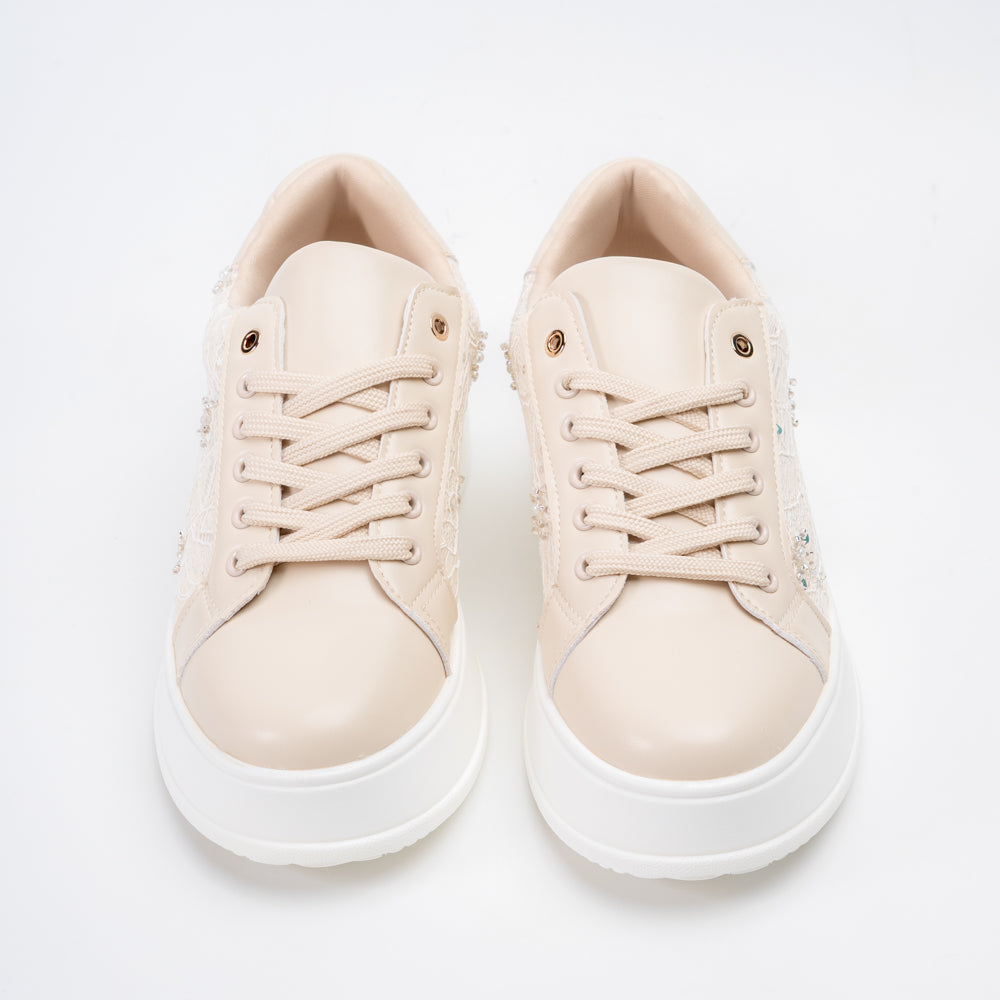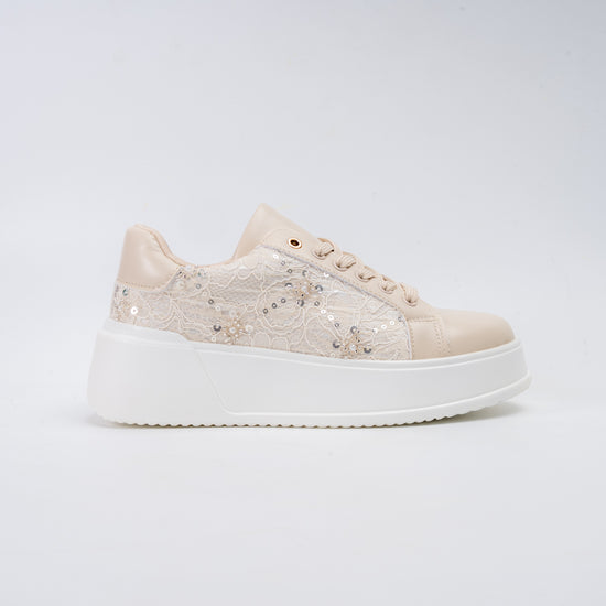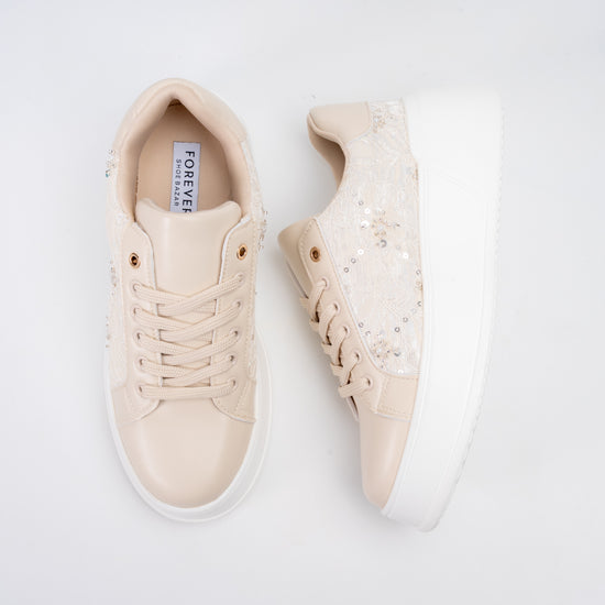 Pure Bliss features a sleek beige upper that mixes smooth faux leather with intricate tonal lace panels scattered with tiny beige sequins for a subtle, luxe shimmer. The high, sculpted white platform sole adds instant height and a fresh, modern contrast, while staying lightweight and cushioned for all-day or all-night wear. Finished with tonal laces and a polished eyelet detail, these fancy shoes are perfect for dinners, parties, concerts, and any occasion where you want chic comfort.
