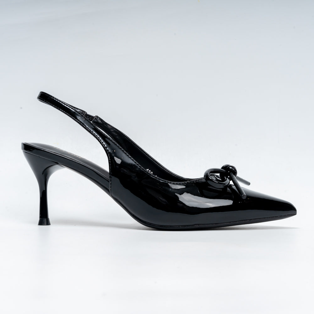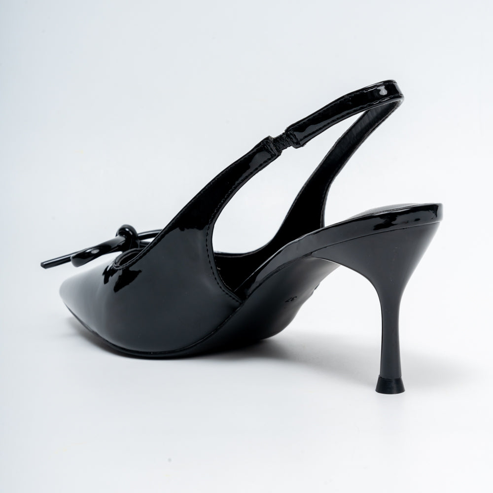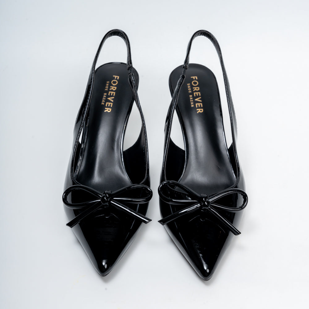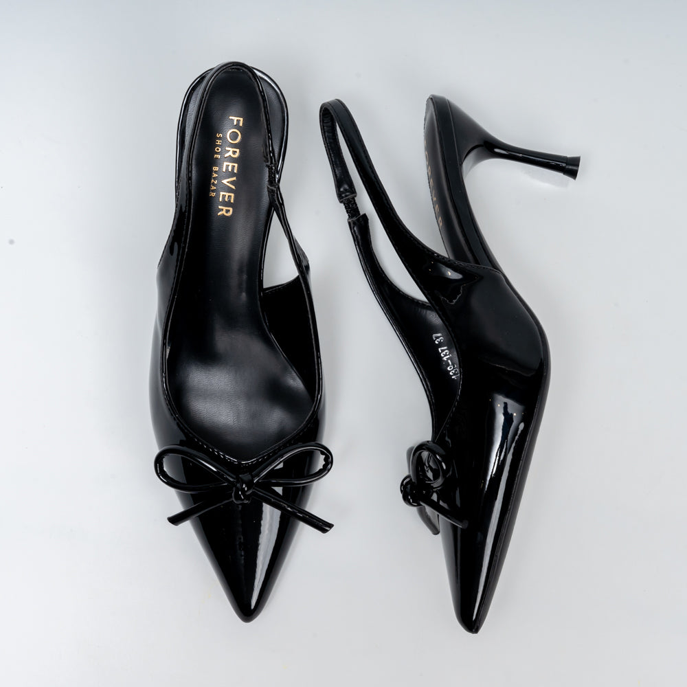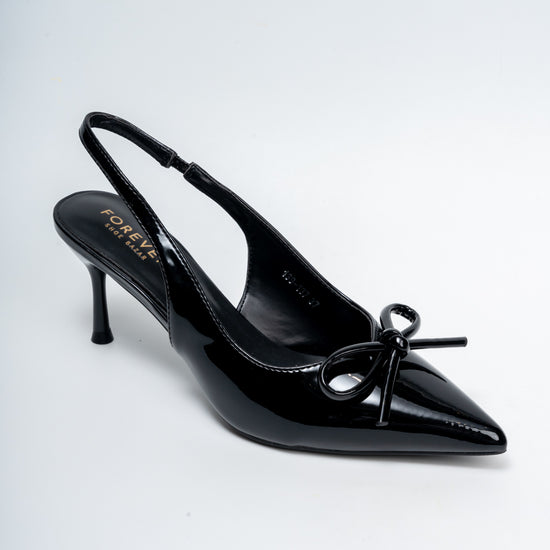 These Amethyst Allure - Black Casual Heels feature a sleek pointed toe and are accented with an elegant front bow for a feminine touch. The glossy finish adds instant polish to your look, complemented by a supportive slingback strap and a comfortable cushioned footbed. Designed for a secure fit and versatile style, these heels are perfect for both day and night outings.