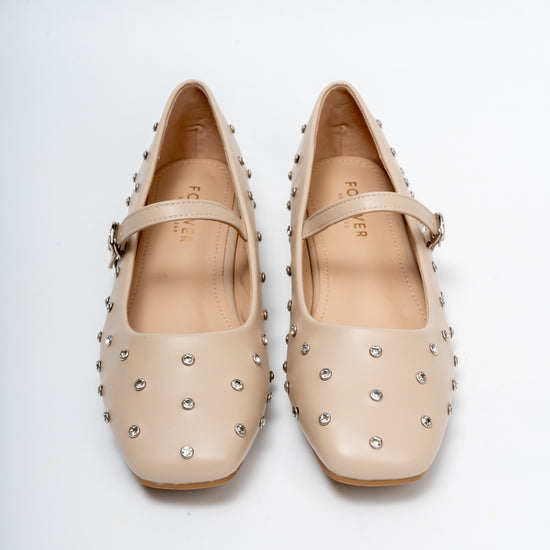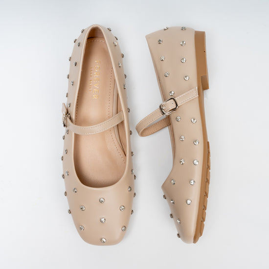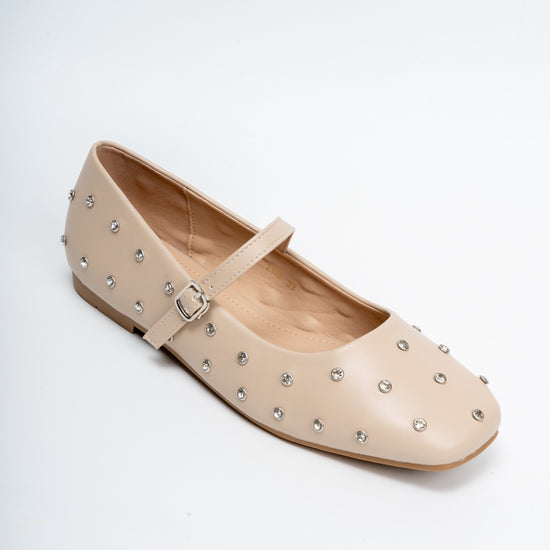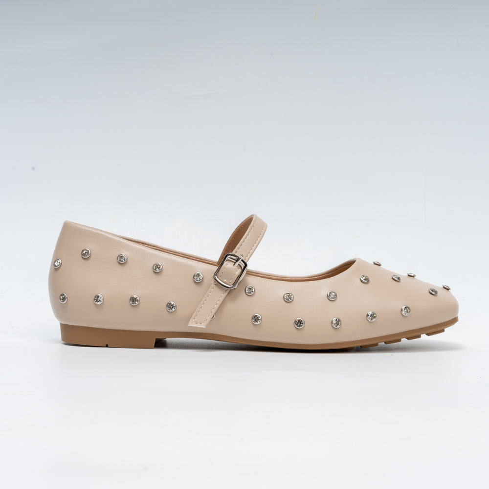 Elevate your look with these The Jewel-Dot - Beige Ballerina, embellished with sparkling crystal studs and finished with a sleek buckle strap for a blend of modern charm and timeless femininity. The soft neutral tone pairs effortlessly with any palette, while the subtle shine from the crystals brings a hint of glamour to your outfit.