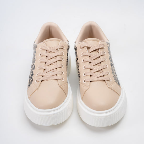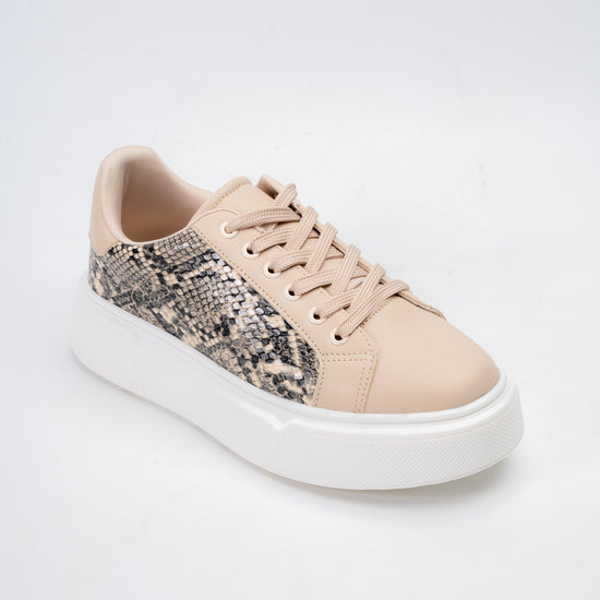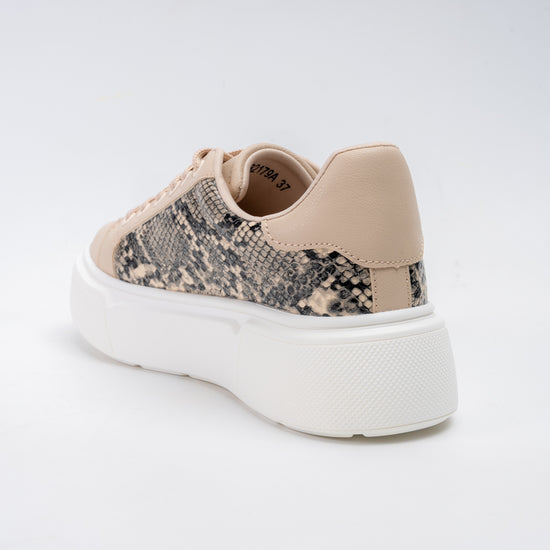 Desert Python - Beige Sneakers feature a smooth beige upper that flatters every skin tone, paired with realistic python-textured panels along the sides for a bold yet wearable contrast. A thick, lightweight white platform sole adds gentle height while offering cushioning and grip, making Desert Python perfect for long walks, coffee runs, and casual outings. Tonal laces, neat stitching, and a softly padded collar complete the design, keeping the overall look premium and versatile.