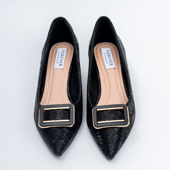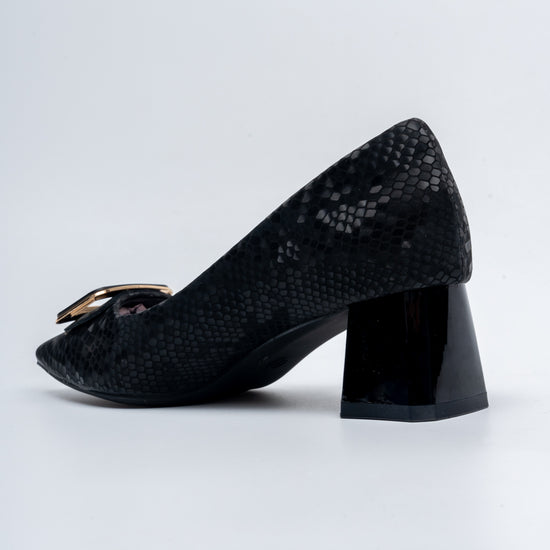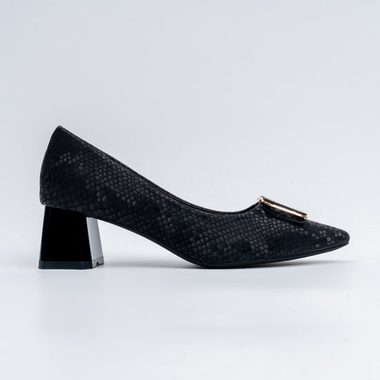 Elevate your wardrobe with these The Gianna Modern - Black Block Heel Pumps featuring a bold buckle accent. Crafted with a subtle reptile-like texture, they strike a beautiful balance between timeless sophistication and contemporary flair. The pointed toe adds a refined silhouette, while the mid-height block heel ensures comfort and poise with every step. A wide metallic buckle sits proudly atop the vamp, serving as both a focal point and a nod to modern design.