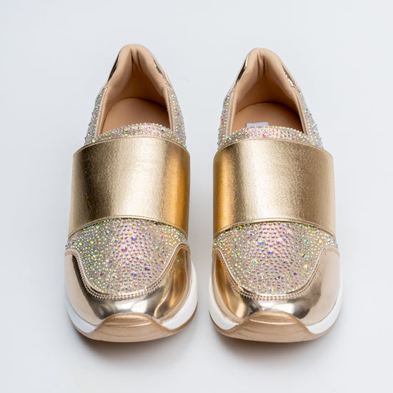 Step into a world of shine and ease with the The Galaxy - Gold Platform Sneakers. Available in luminous gold and chrome-silver finishes, each pair features a broad elastic band across the vamp for effortless wear. The upper dazzles with a combination of dazzling micro-rhinestones and high-gloss metallic panels. A chunky platform sole offers a sleek boost in height and comfort, pulling together futurism and style in perfect harmony.