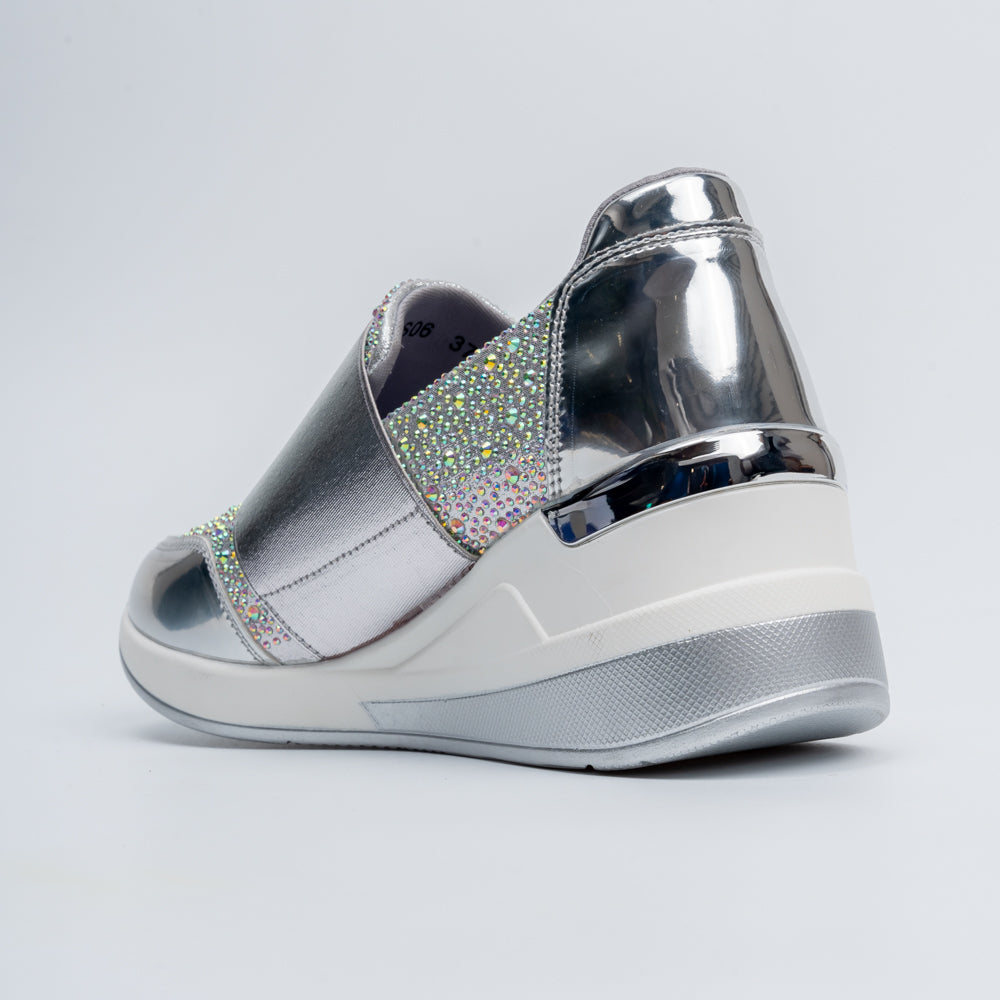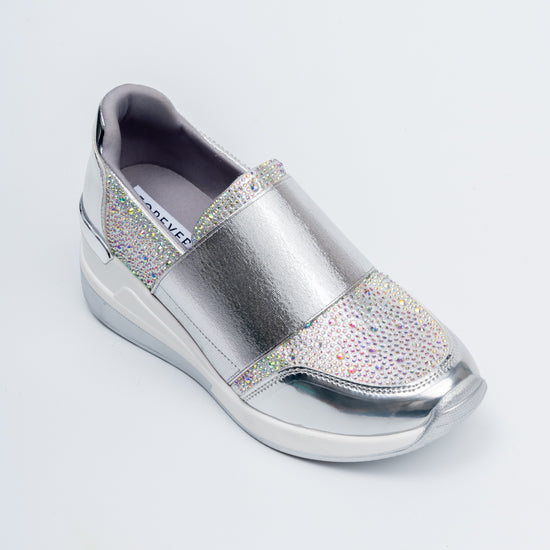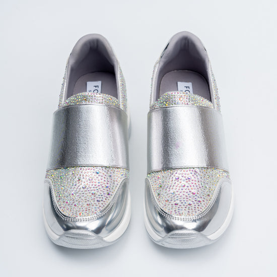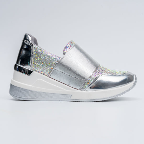 Step into a world of shine and ease with the The Galaxy - Silver Platform Sneakers. Available in luminous gold and chrome-silver finishes, each pair features a broad elastic band across the vamp for effortless wear. The upper dazzles with a combination of dazzling micro-rhinestones and high-gloss metallic panels. A chunky platform sole offers a sleek boost in height and comfort, pulling together futurism and style in perfect harmony.