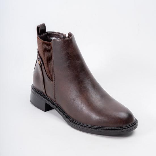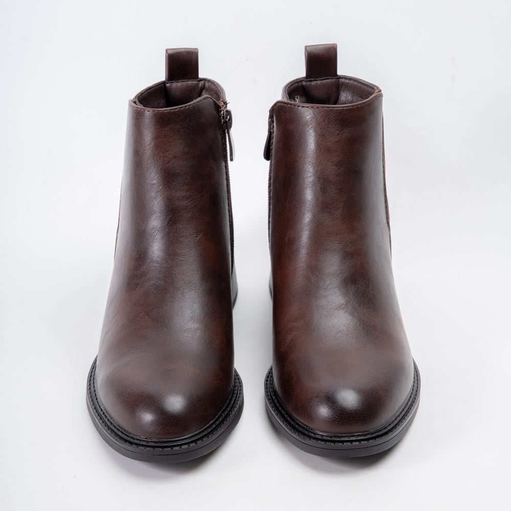 These boots feature a smooth faux-leather finish, elastic side panels for an easy slip-on fit, and sturdy low block heel for extra support during long walks. Their versatile color and minimalist design make them ideal for casual outings or layering through the seasons. Subtle metallic accents and clean stitches add a refined detail, giving a polished look without sacrificing comfort.