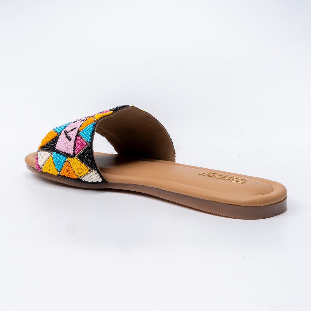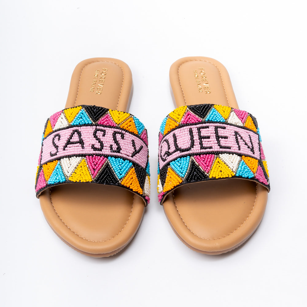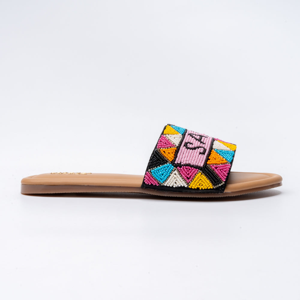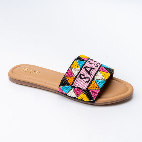 Turn up the charm with these vibrant Hand-Beaded “Sassy” Slides that blend playful attitude with boho chic flair. Crafted with intricate multicolored beadwork, these flats instantly brighten up any outfit. The cushioned tan footbed offers all-day comfort, while the wide band provides a secure fit with statement style.