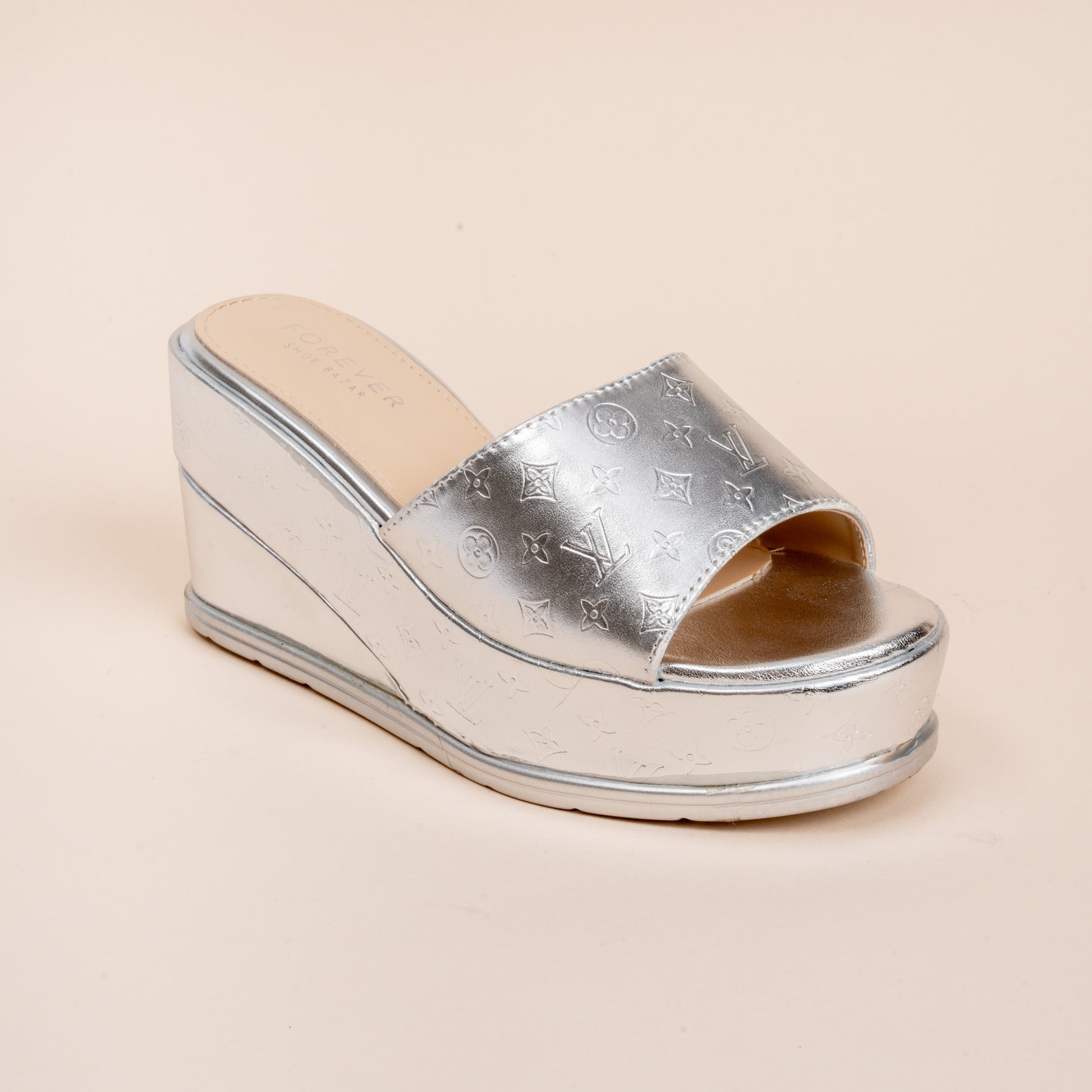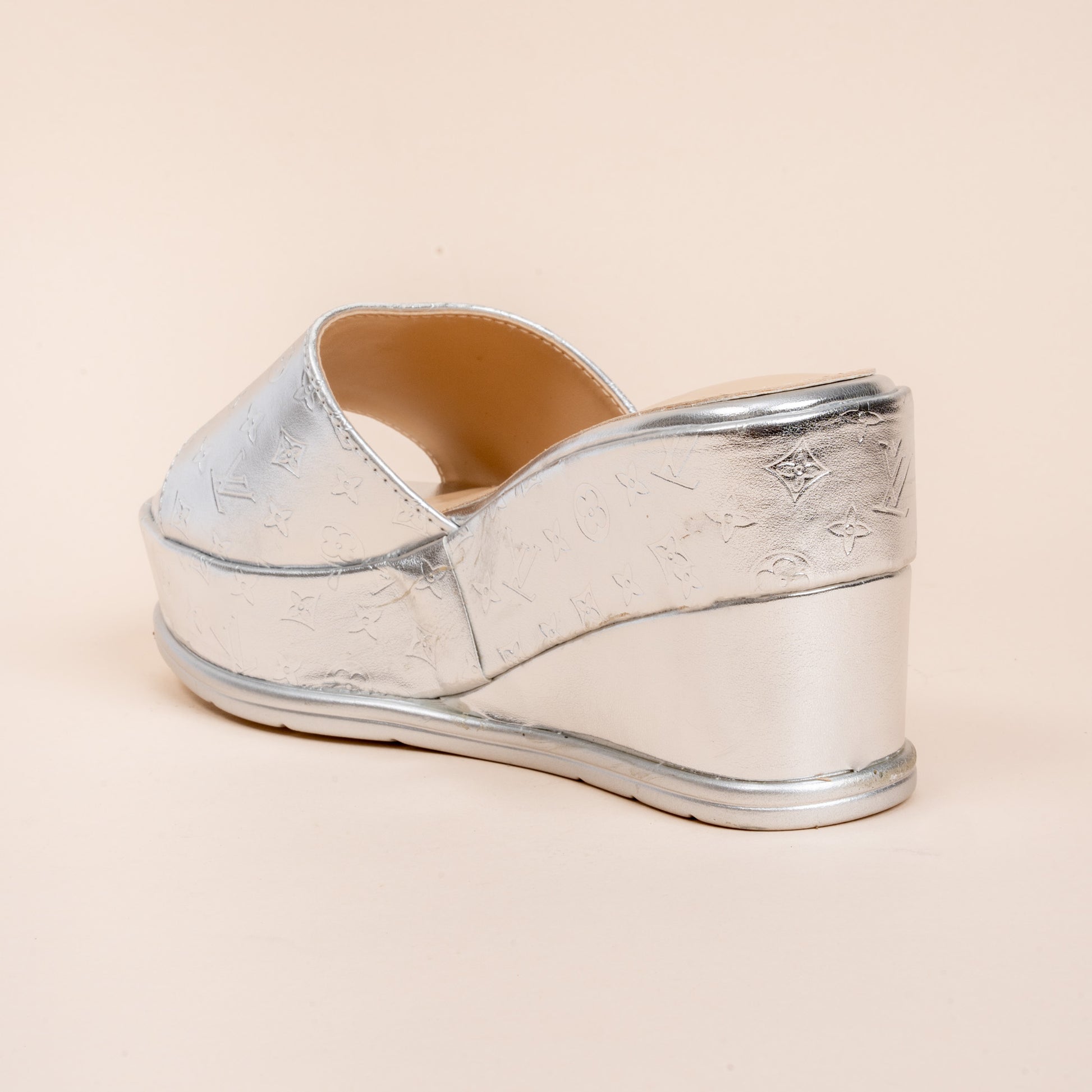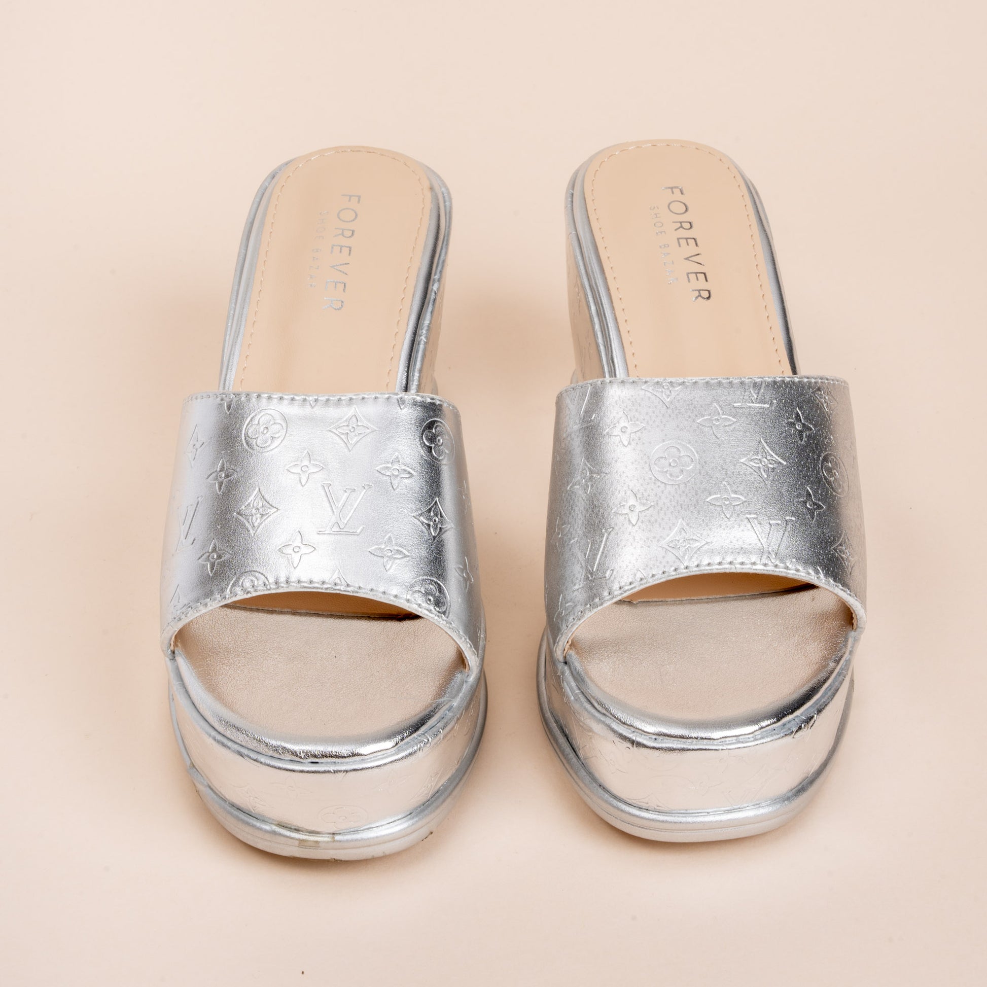Product Details Material: PU(Polyurethane) USP: Textured Upper Closure Type: Platform Slipper Colour: Silver Heel Height: 8.0 cm Occasion: Party Wear Shoe Sole: PU Sole |