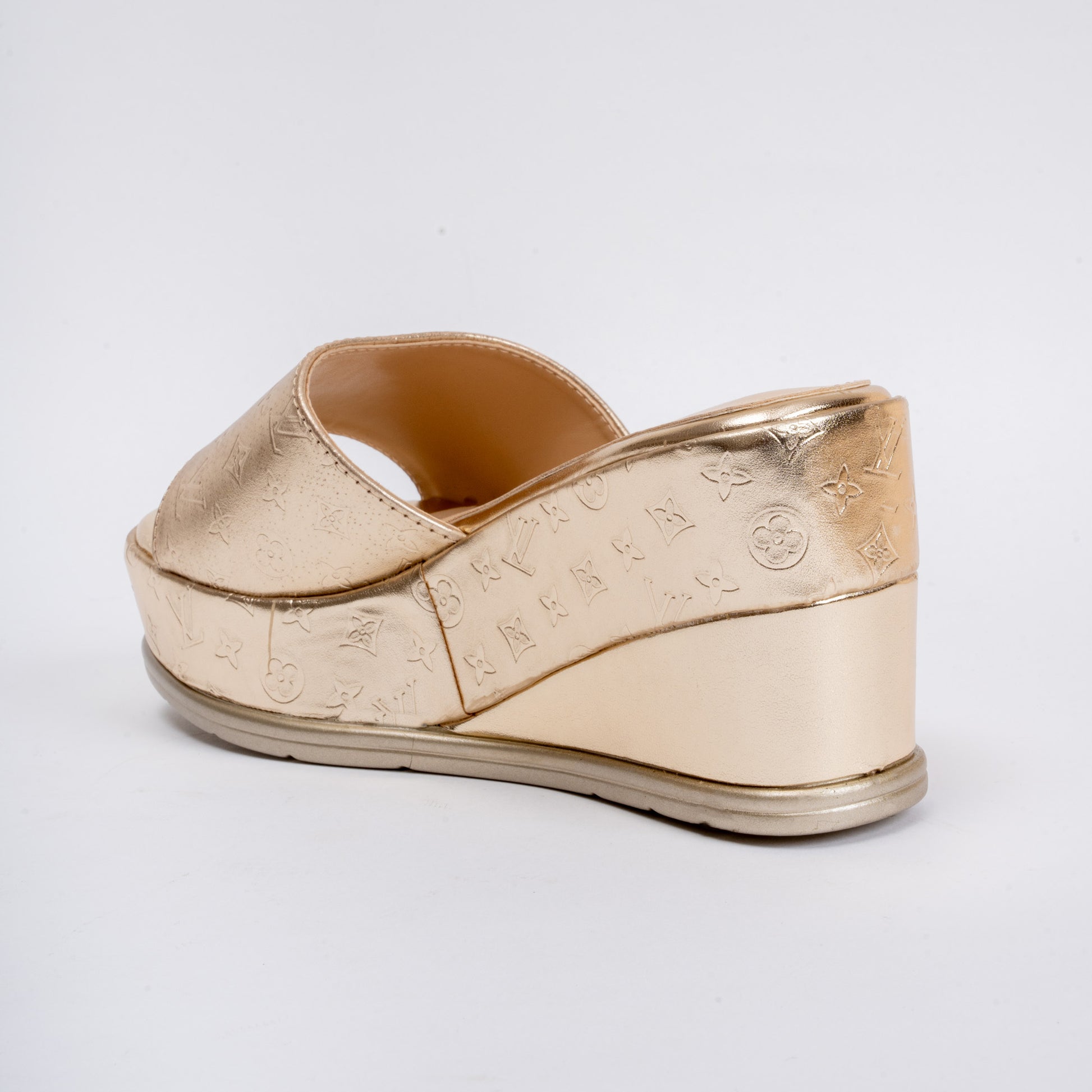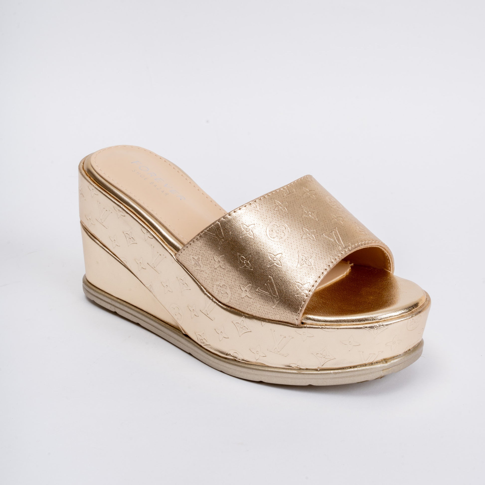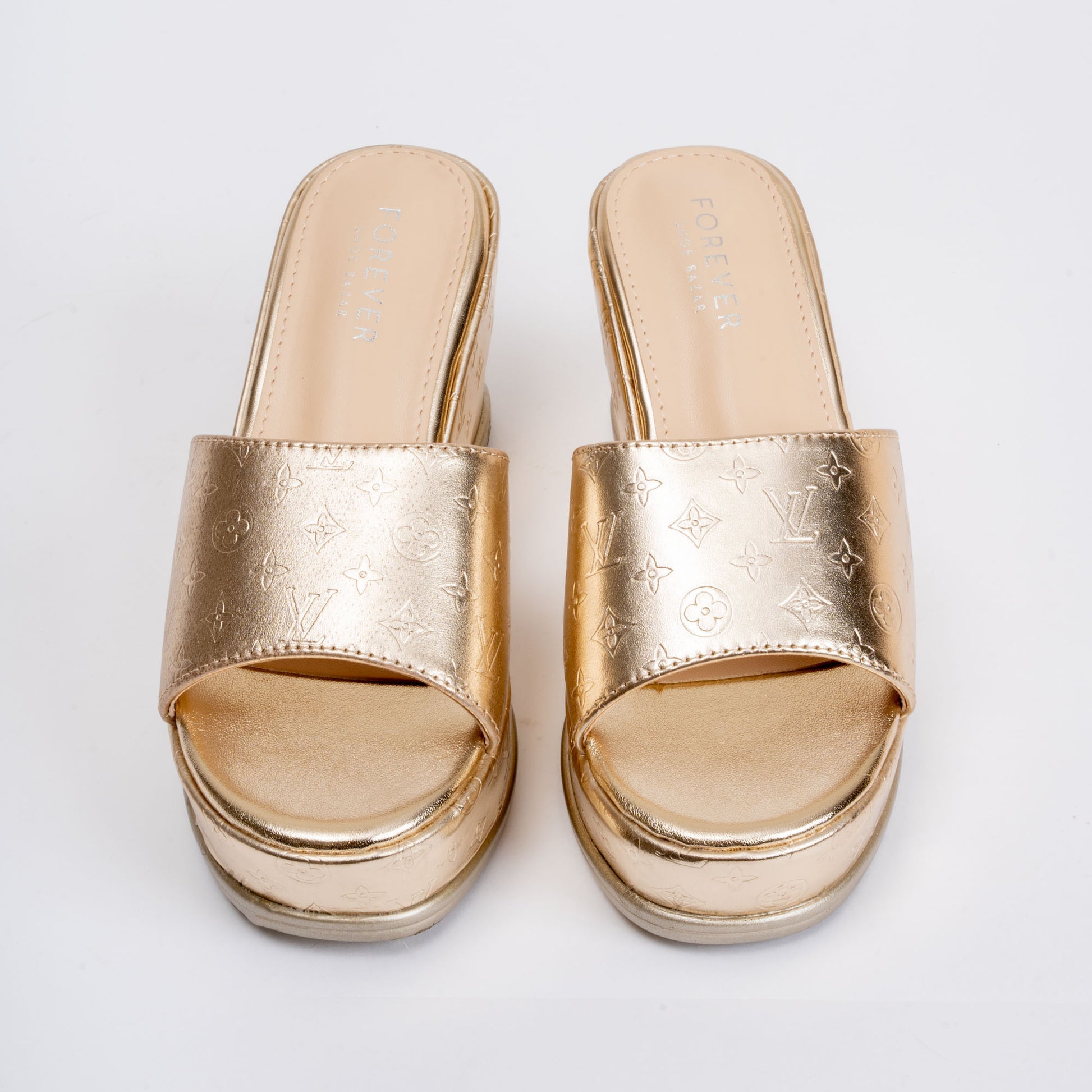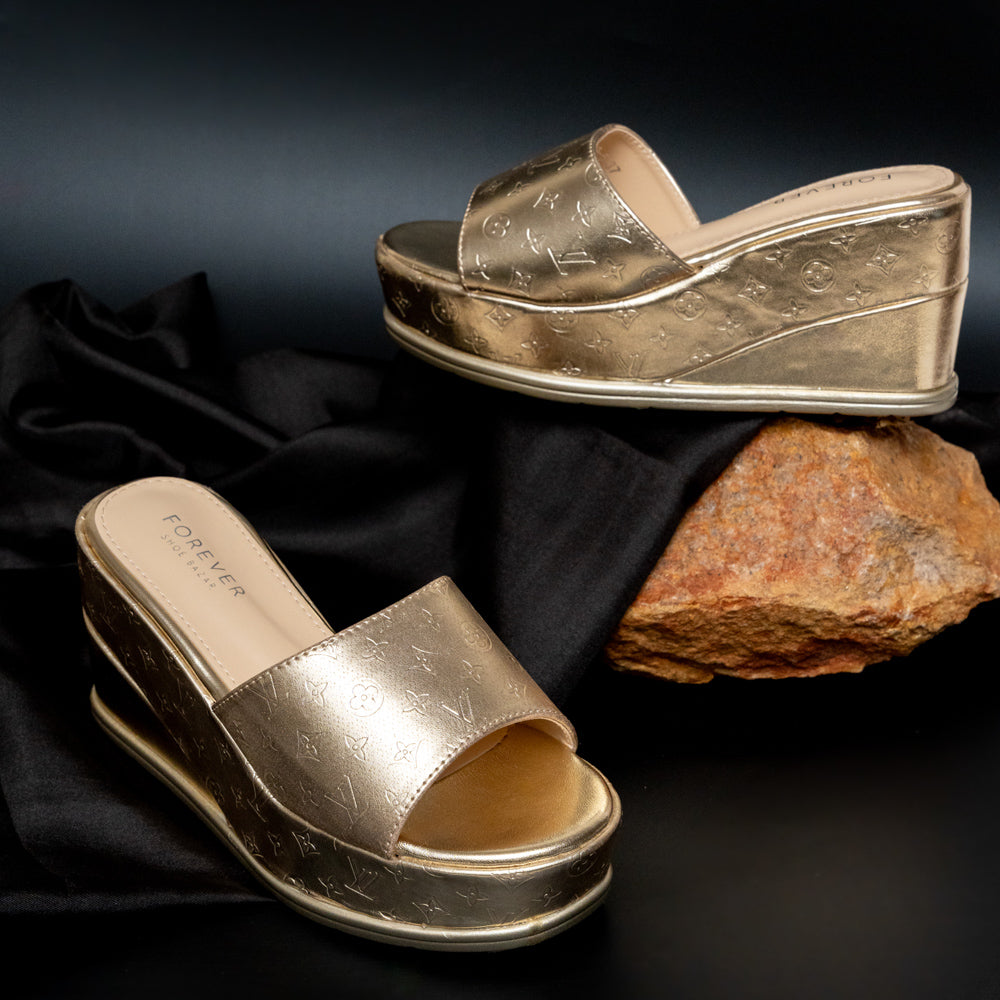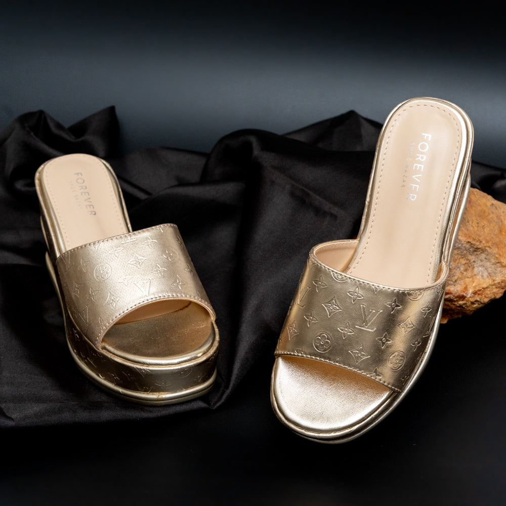 Product Details Material: PU(Polyurethane) USP: Textured Upper Closure Type: Platform Slipper Colour: Gold Heel Height: 8.0 cm Occasion: Party Wear Shoe Sole: PU Sole |